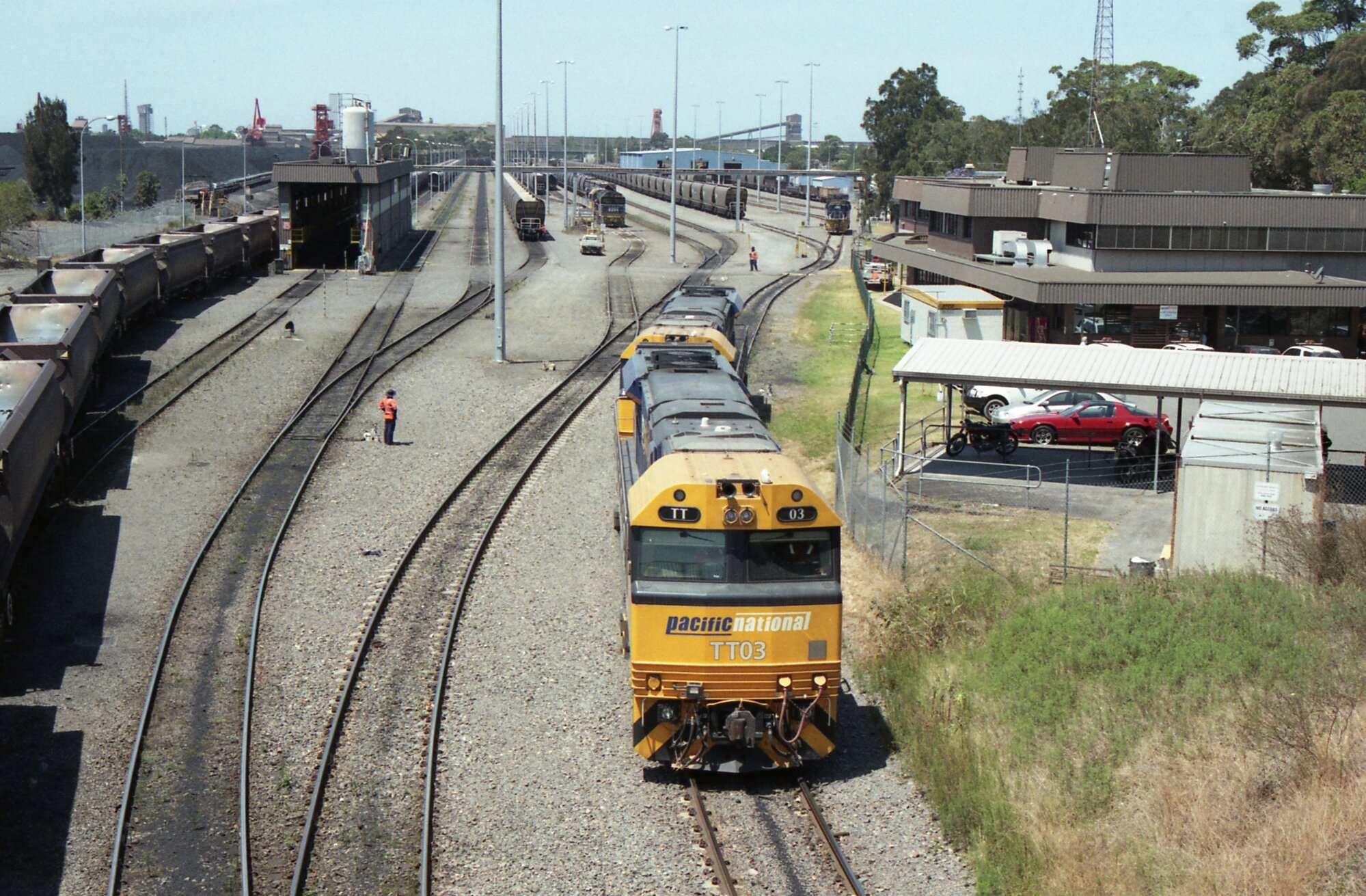 TT03 and a classmate stand on the hot road while a coal train leaves from NINE departure at Port Waratah, November 2012