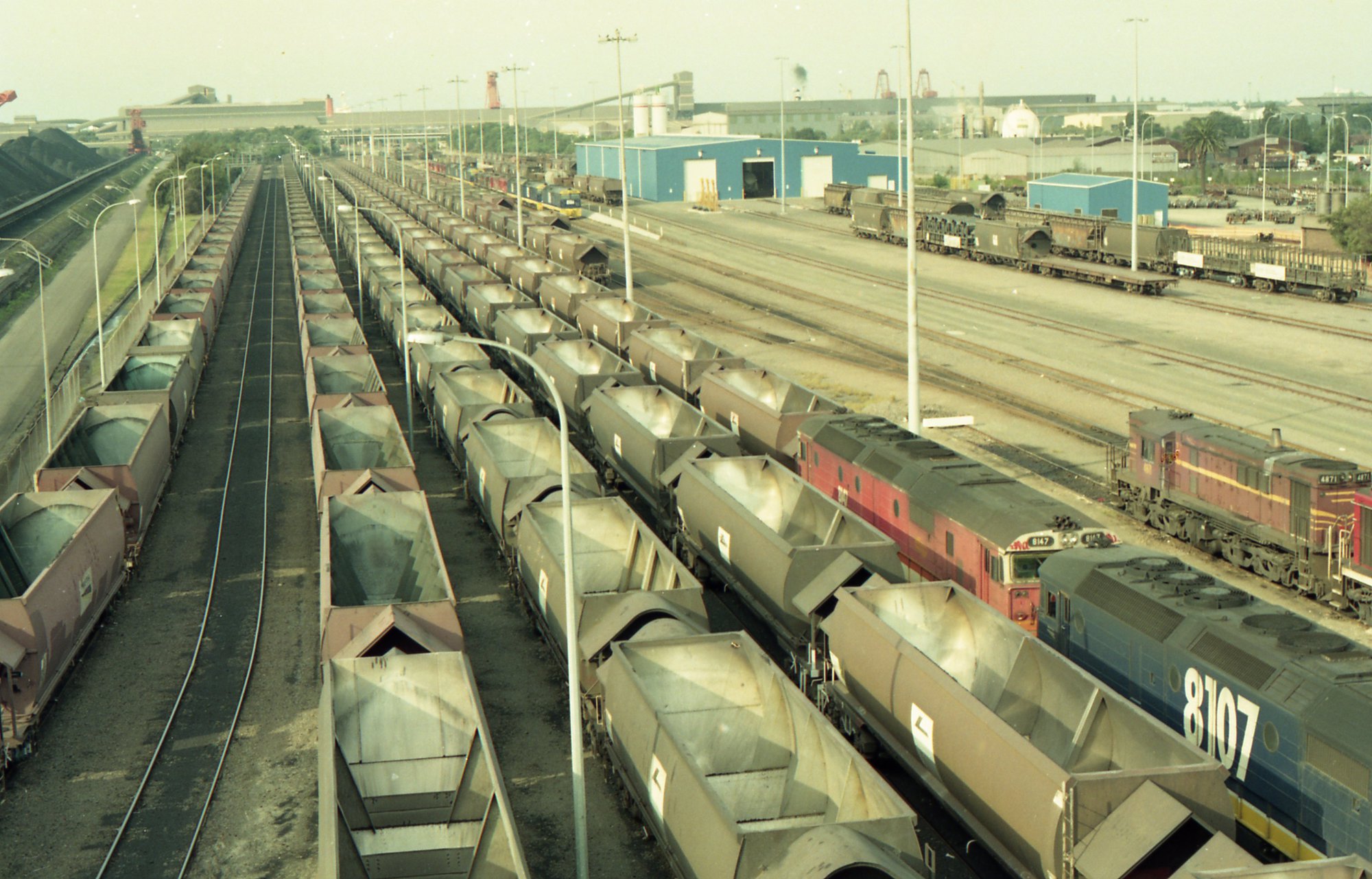 Sansom, Peter, A mixture of coal hoppers seen from the sand tower at Port Waratah., [Sansom_PW_1972-2017_186]. Living Histories, accessed 15/02/2026, https://livinghistories.newcastle.edu.au/nodes/view/74773