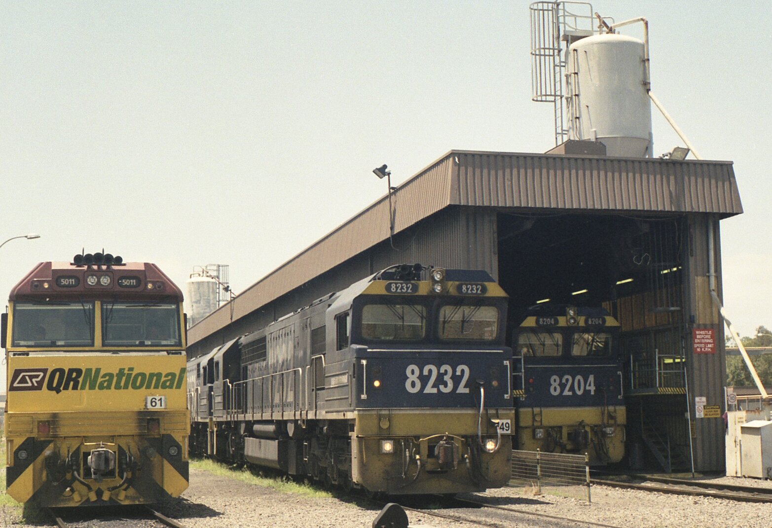 QR National 5011 stands on TEN departure, 8232 stands on its train on NINE departure while 8204 is serviced.