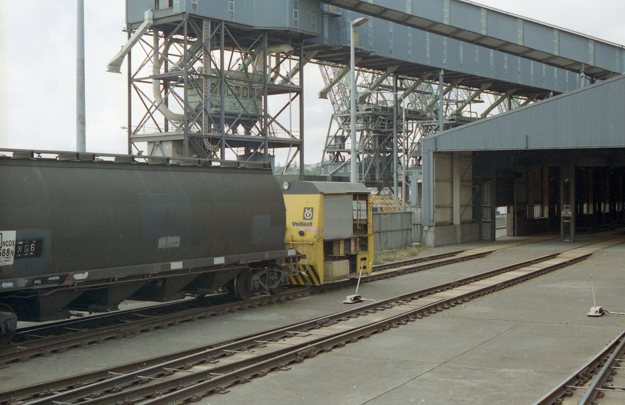 A Vollert locomotive pushing grain hoppers out of the track shed at the silos at Carrington, December 1999.