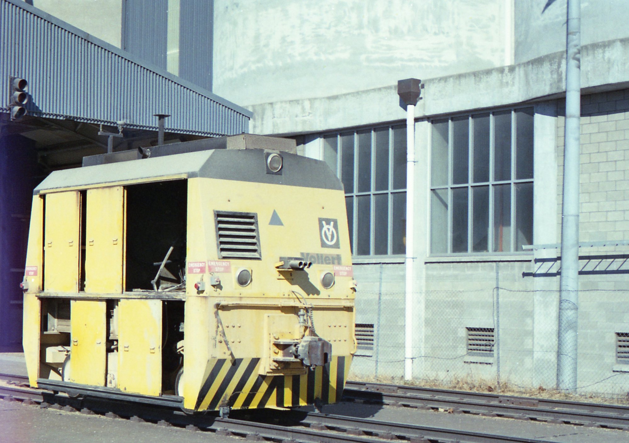 Sansom, Peter, A Vollert locomotive near the track shed at the silos at Carrington. (1999-12), [Sansom_PW_1972-2017_614]. Living Histories, accessed 18/03/2026, https://livinghistories.newcastle.edu.au/nodes/view/75110