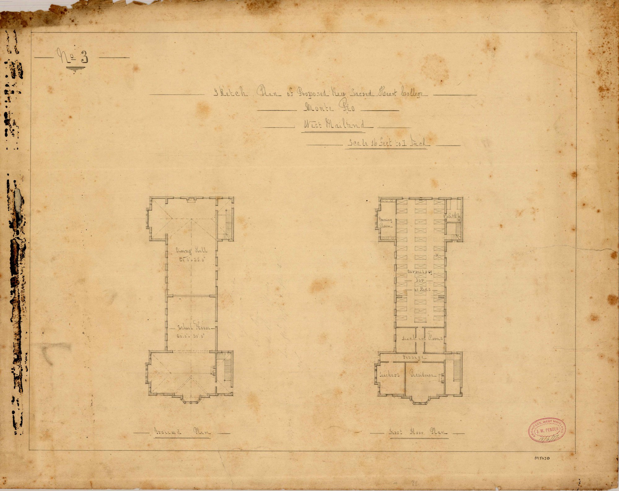 Pender, John Wiltshire, 1833-1917, Sketch Plan of Proposed New Sacred Heart College, at Monte Pio - No. 3 (18 June 1877) (1877-07-28), [M5030-sk3]. Living Histories, accessed 14/01/2026, https://livinghistories.newcastle.edu.au/nodes/view/75420