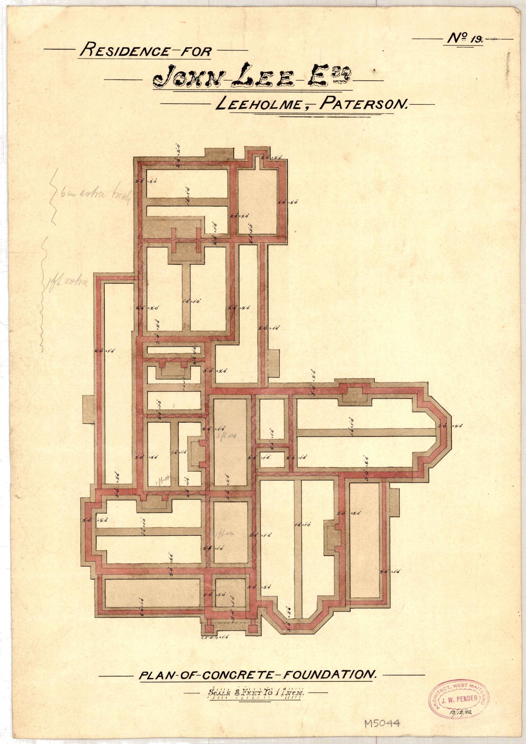 Pender, John Wiltshire, 1833-1917, Plan of Concrete Foundation for the Residence of John Lee Esq. - No. 19 (13 December 1882) (1882-12-13), [M5044-4]. Living Histories, accessed 19/03/2026, https://livinghistories.newcastle.edu.au/nodes/view/75451