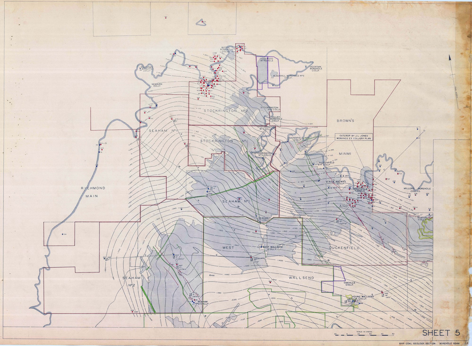 B.H.P. Coal Geology Section, Newcastle, Sheet 5B - Sheet 5A - Borehole seam. Richmond Main, Seaham, Stockrington, West Wallsend, Duckenfield and Minmi Collieries ([1960s]), [M7022-015-BHP]. Living Histories, accessed 17/02/2026, https://livinghistories.newcastle.edu.au/nodes/view/75475