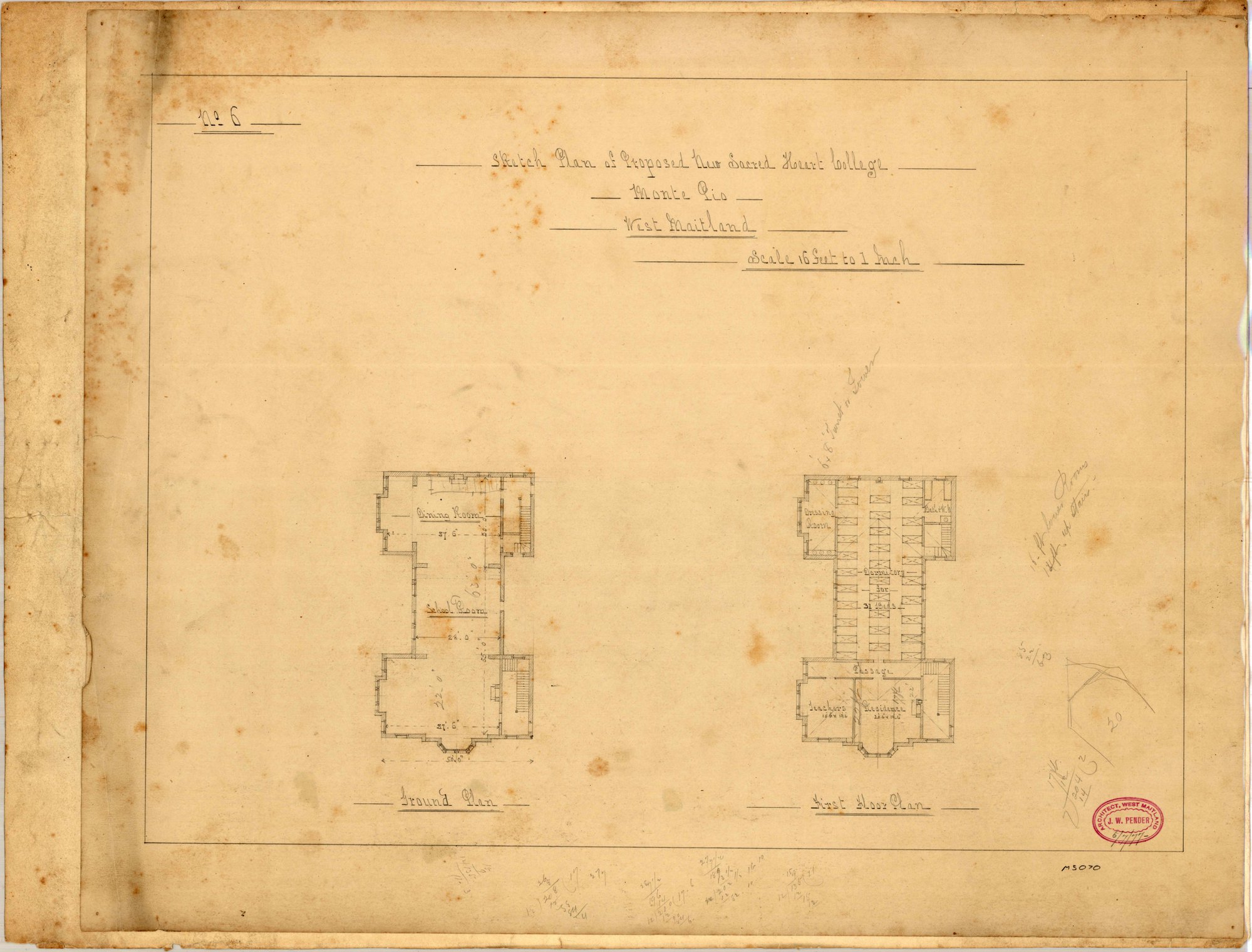 Pender, John Wiltshire, 1833-1917, Sketch Plan of Proposed New Sacred Heart College, at Monte Pio - No. 6 (6 July 1877) (1877-07-06), [M5070-6]. Living Histories, accessed 18/03/2026, https://livinghistories.newcastle.edu.au/nodes/view/75505