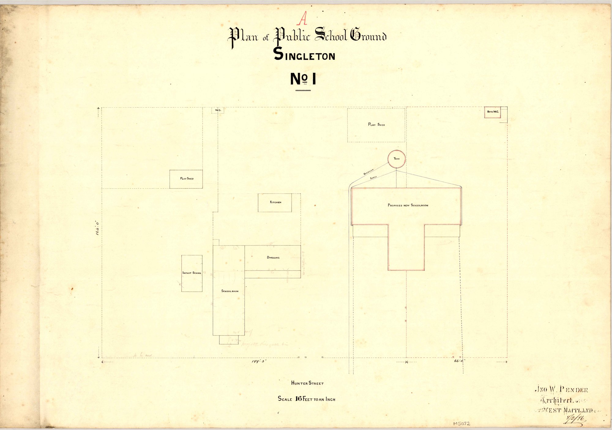 Pender, John Wiltshire, 1833-1917, Plan of Public School Ground, Singleton - No. 1 (8 February 1876) (1876-02-08), [M5072-1r]. Living Histories, accessed 01/05/2026, https://livinghistories.newcastle.edu.au/nodes/view/75507