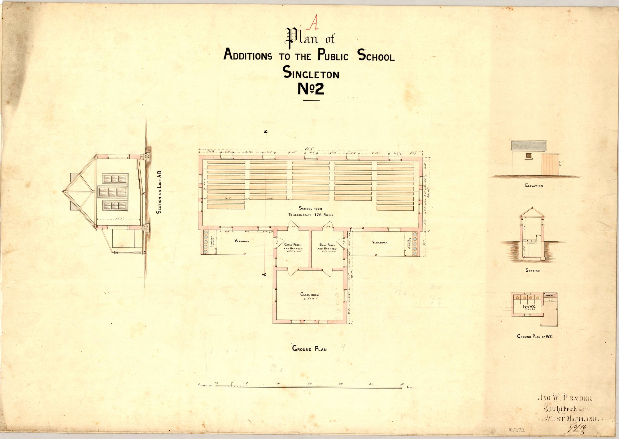 Pender, John Wiltshire, 1833-1917, Plan of Additions to the Singleton Public School - No. 2 (8 February 1876) (1876-02-08), [M5072-2]. Living Histories, accessed 20/01/2026, https://livinghistories.newcastle.edu.au/nodes/view/75509