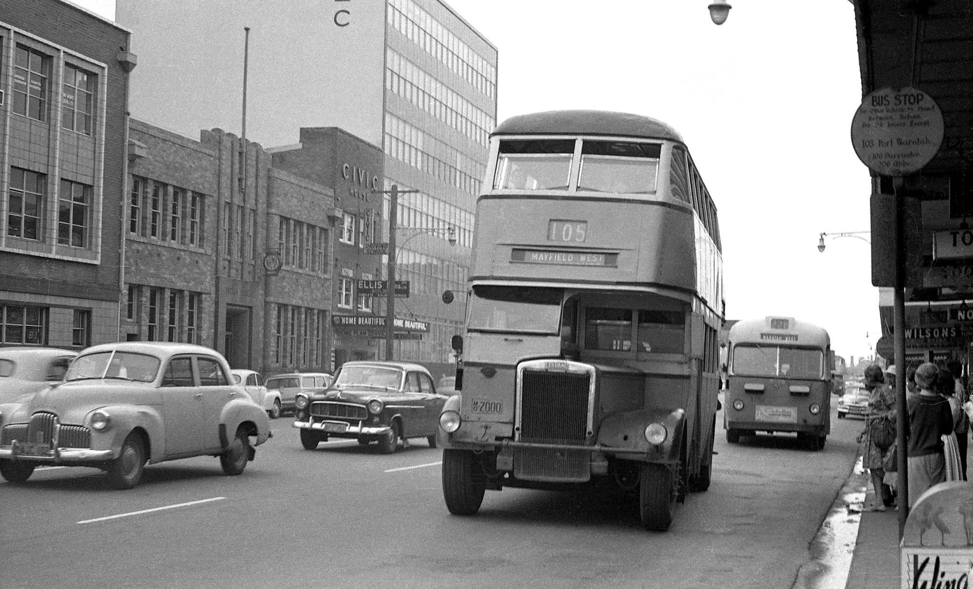 Ward, John, DGT Leyland OPD2-1 2000, Leyland OPSU1-1 2752, Hunter Street, Civic, Newcastle, NSW, 30 March 1963 (30th March 1963), [00051_3003636307-30 ]. Living Histories, accessed 17/04/2026, https://livinghistories.newcastle.edu.au/nodes/view/75600