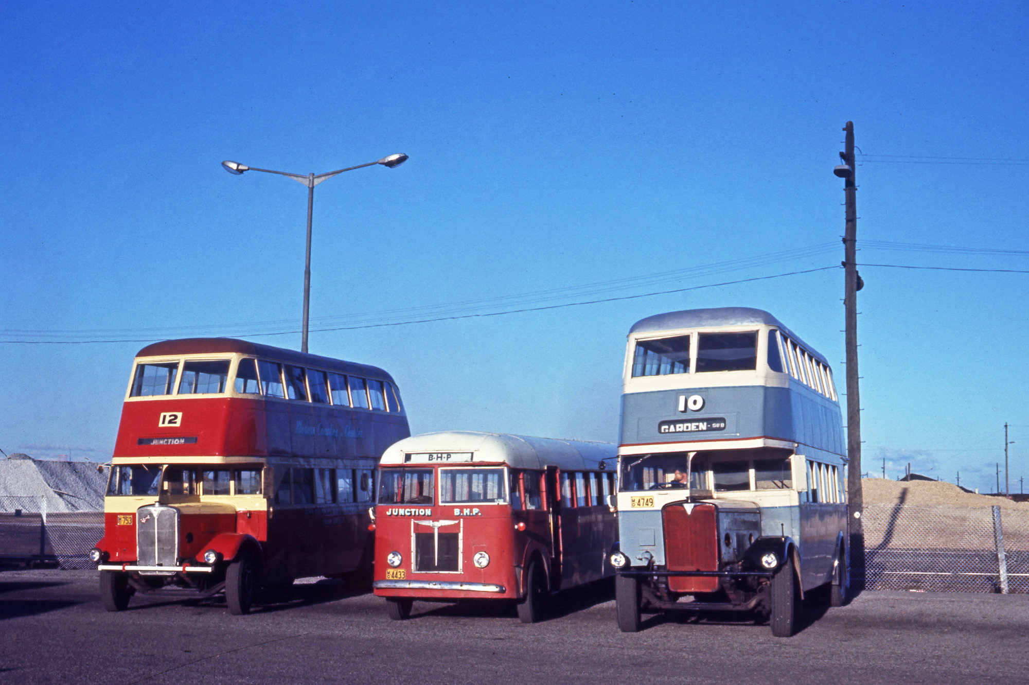 Chapmans - Hamilton AEC Regent 753 (x DRT&T 1577) White 4433, Allomes - Garden Suburb AEC Regent 4749 (x DRT&T 1286), Port Waratah Steelworks, Newcastle, NSW, 18 May 1968