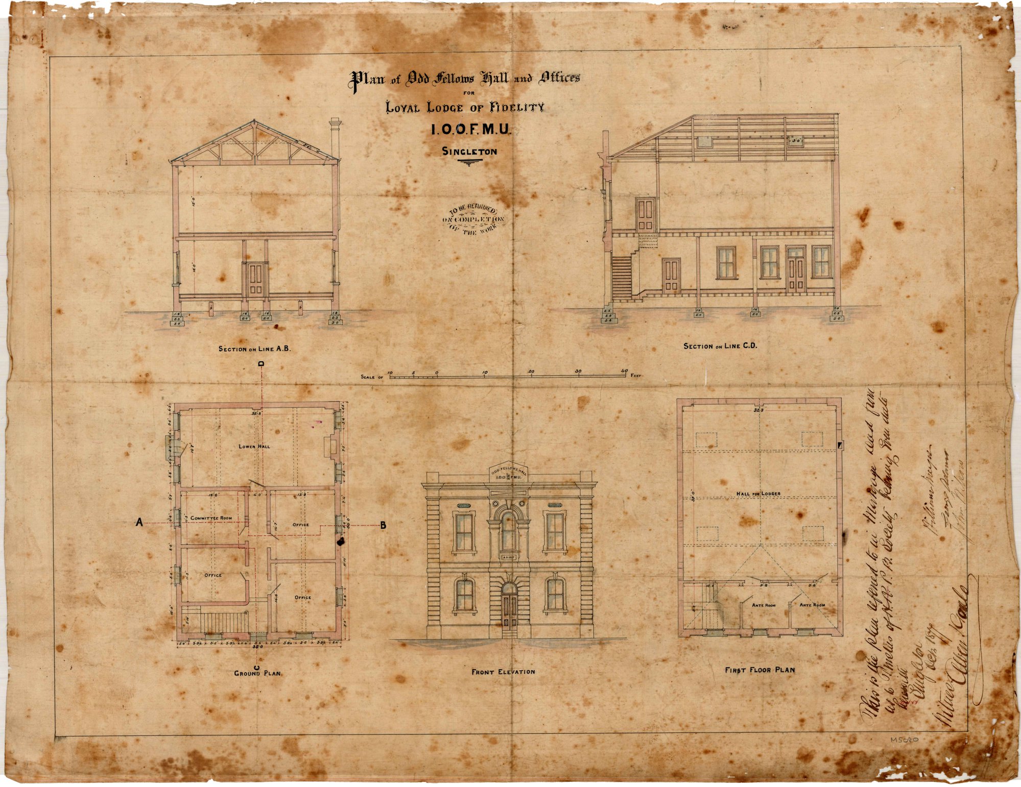 Pender, John Wiltshire, 1833-1917, Plan of Odd Fellows Hall & Offices for Loyal Lodge of Fidelity I.O.O.F.M.U. (9 January 1877) (1877-01-09), [M5080-1]. Living Histories, accessed 18/03/2026, https://livinghistories.newcastle.edu.au/nodes/view/75759