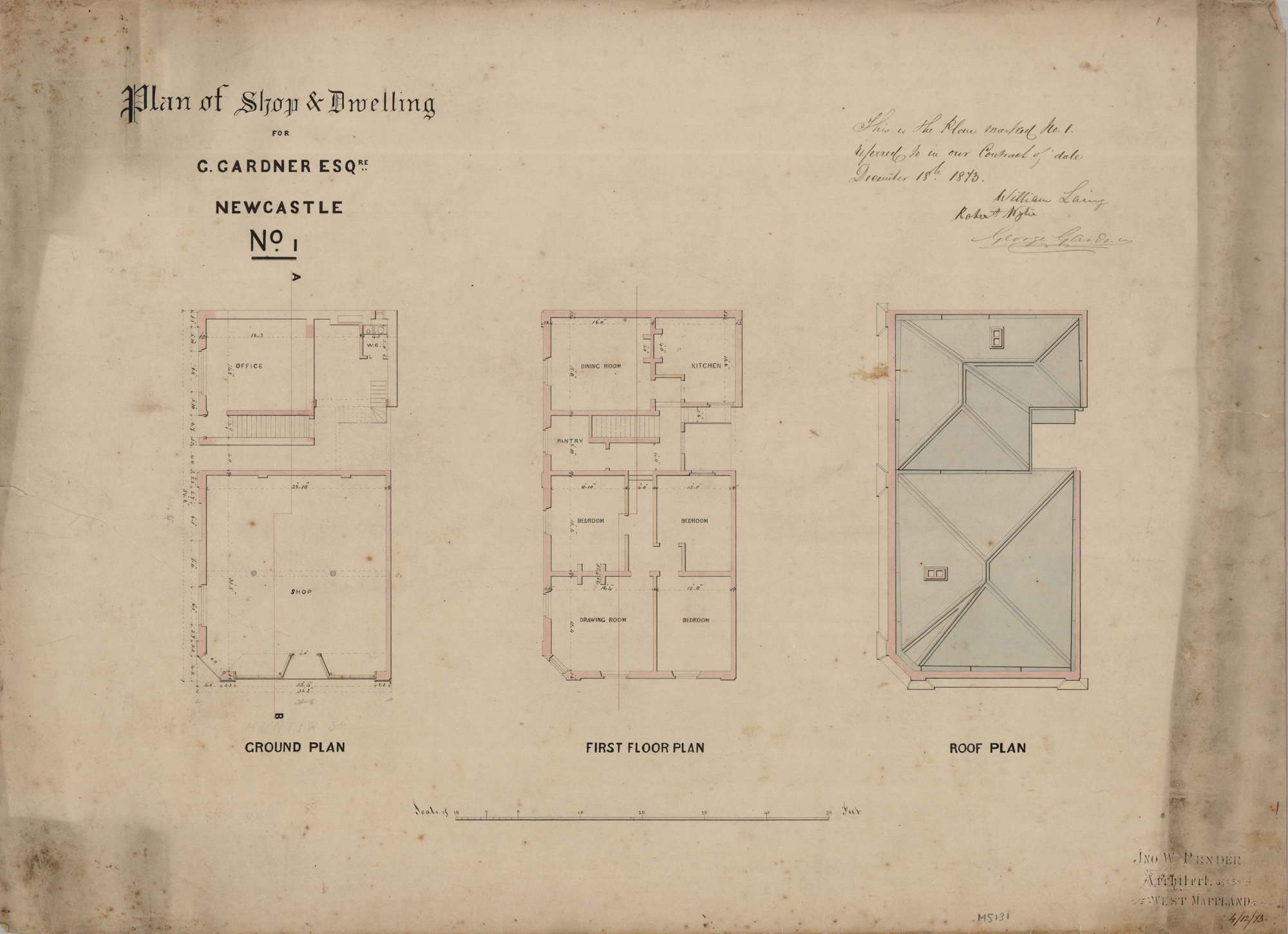 Pender, John Wiltshire (1833-1917), Plan of a shop and dwelling for G. Gardner, cnr Hunter and Newcomen Streets, Newcastle (4 December 1873) (1873-12-04), [M5131-1]. Living Histories, accessed 11/03/2026, https://livinghistories.newcastle.edu.au/nodes/view/75840