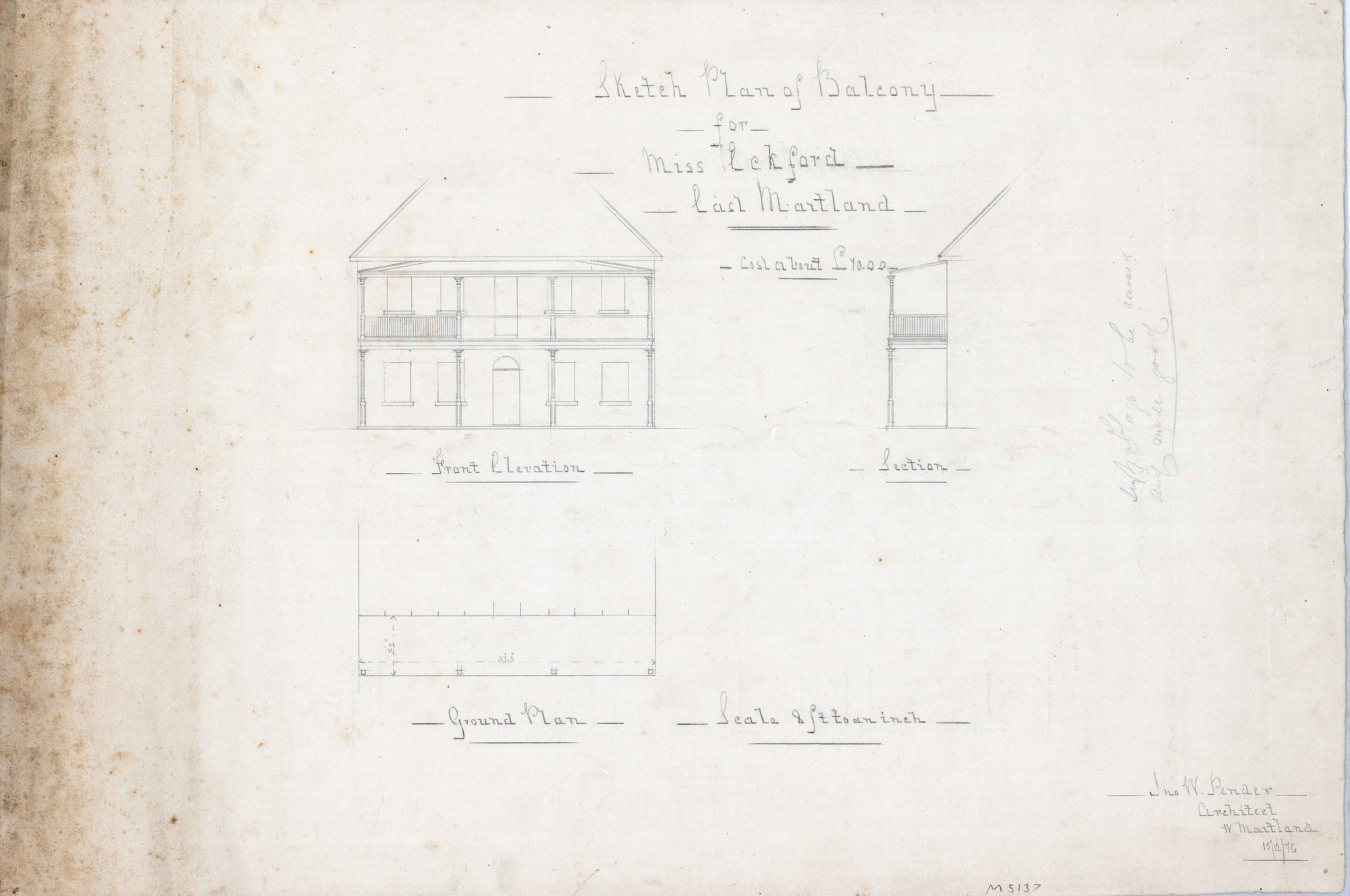 Pender, John Wiltshire, 1833-1917, Plan of a balcony for Miss Eckford, East Maitland, NSW (15 December 1876) (1876-12-15), [M5137]. Living Histories, accessed 19/03/2026, https://livinghistories.newcastle.edu.au/nodes/view/75936
