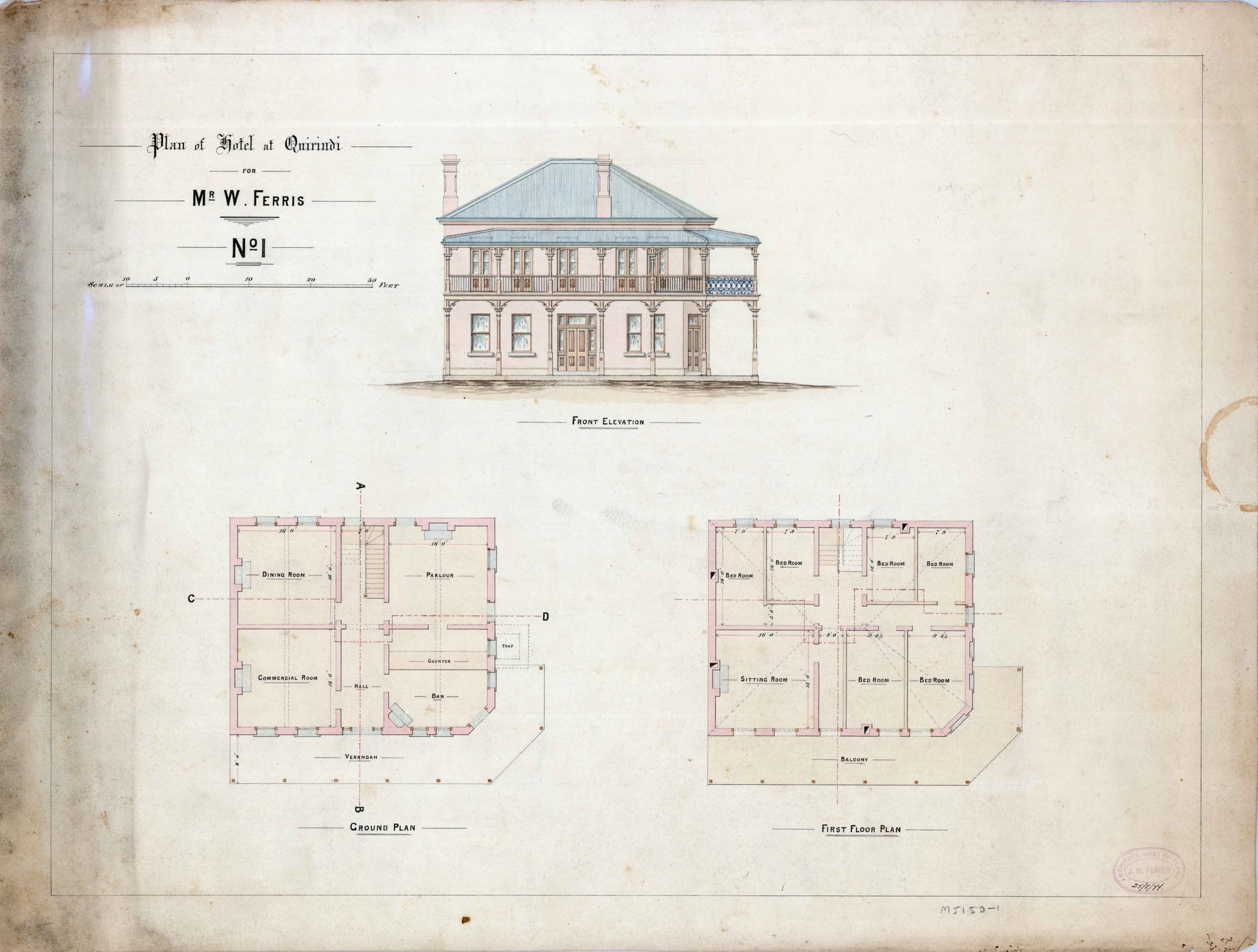 Pender, John Wiltshire, 1833-1917, Plan of a hotel at Quirindi, NSW (27 August 1877) (1877-08-27), [M5150-1]. Living Histories, accessed 18/01/2026, https://livinghistories.newcastle.edu.au/nodes/view/75957