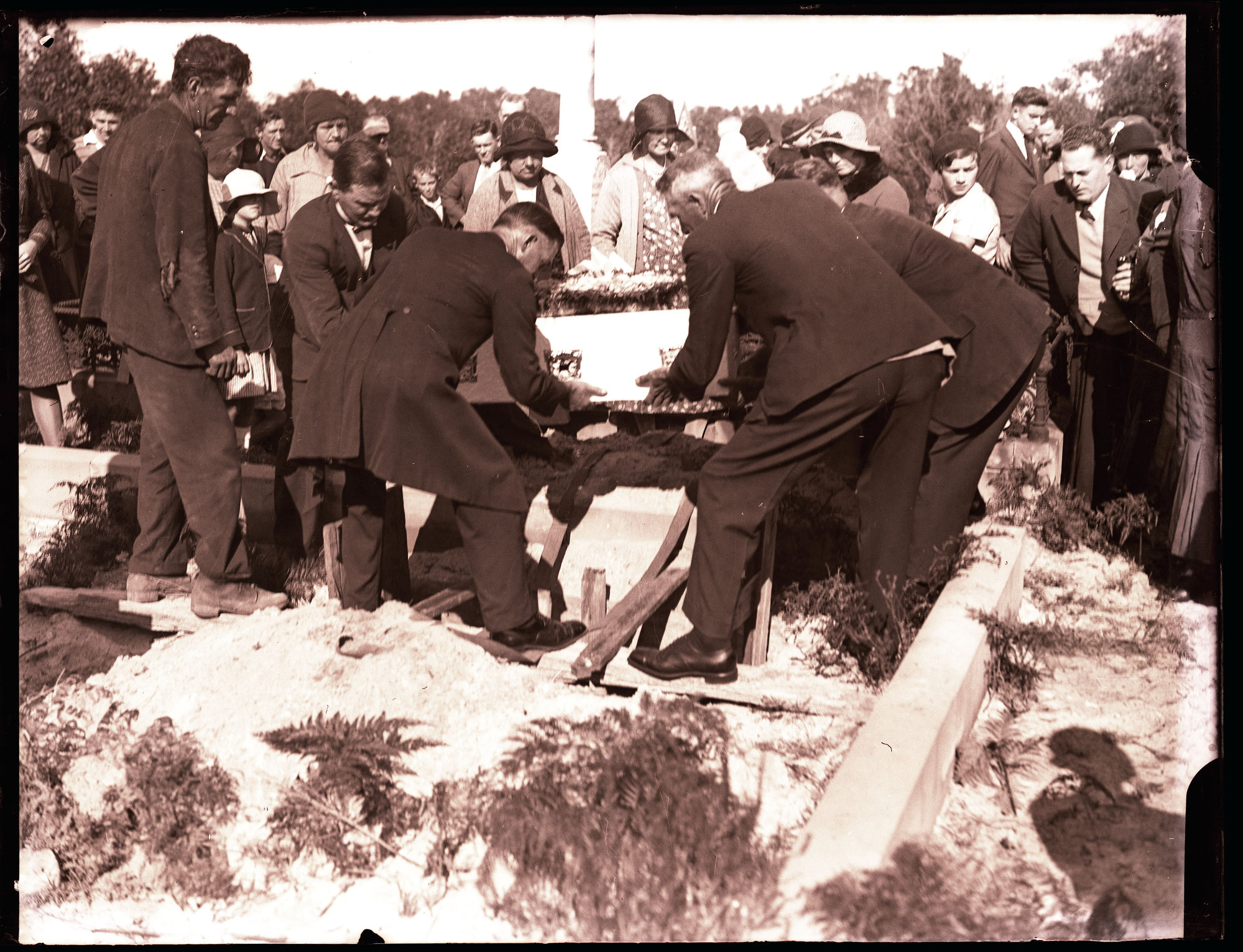 Coffin being lowered into grave plot at Funeral of Betty Cloutt, 2 June 1932
