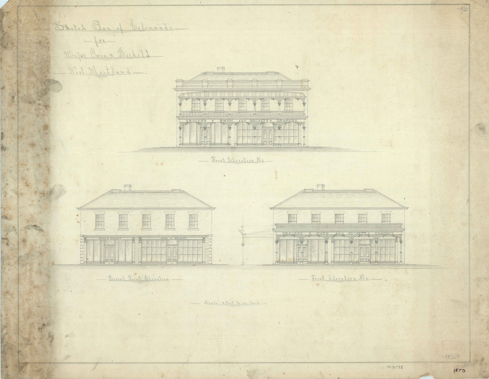 Pender, John Wiltshire, 1833-1917, Plan of a colonnade, West Maitland, NSW (29 March 1879) (1879-03-29), [M5178]. Living Histories, accessed 24/01/2026, https://livinghistories.newcastle.edu.au/nodes/view/76549