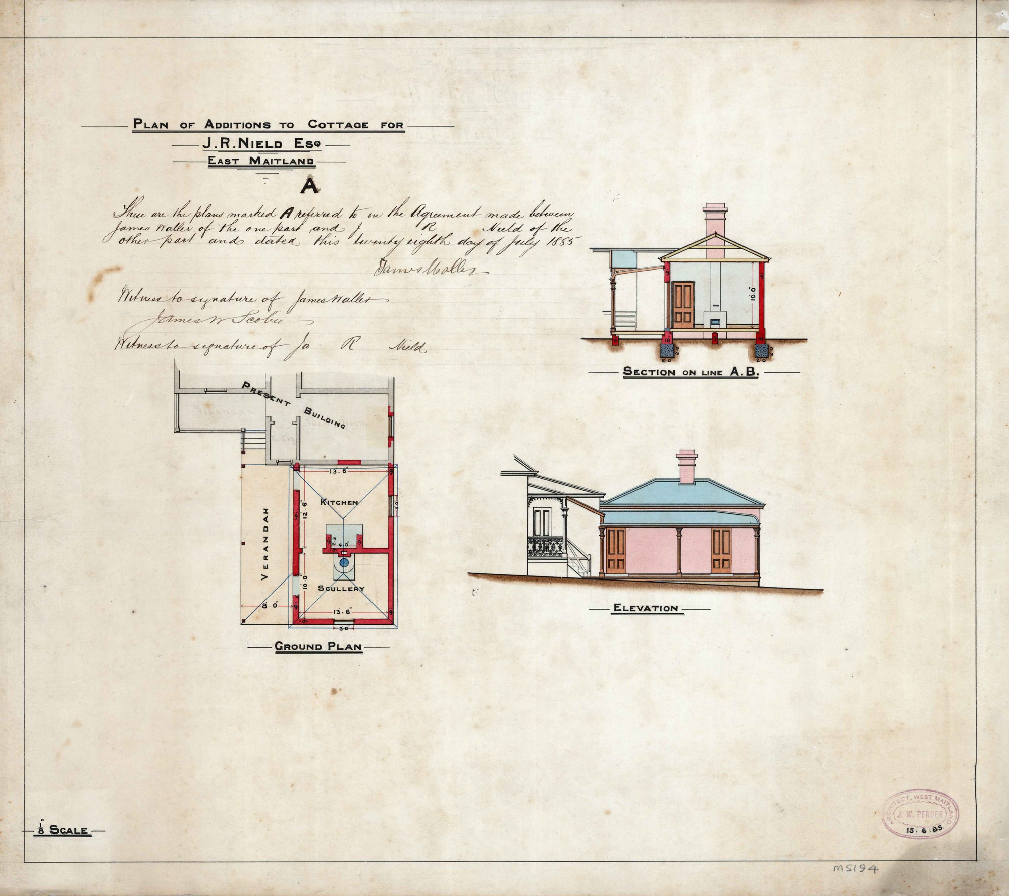 Pender, John Wiltshire, 1833-1917, Plan of additions to a cottage for J.R. Nield, East Maitland, NSW (15 June 1885) (1885-06-15), [M5194]. Living Histories, accessed 08/02/2026, https://livinghistories.newcastle.edu.au/nodes/view/76582