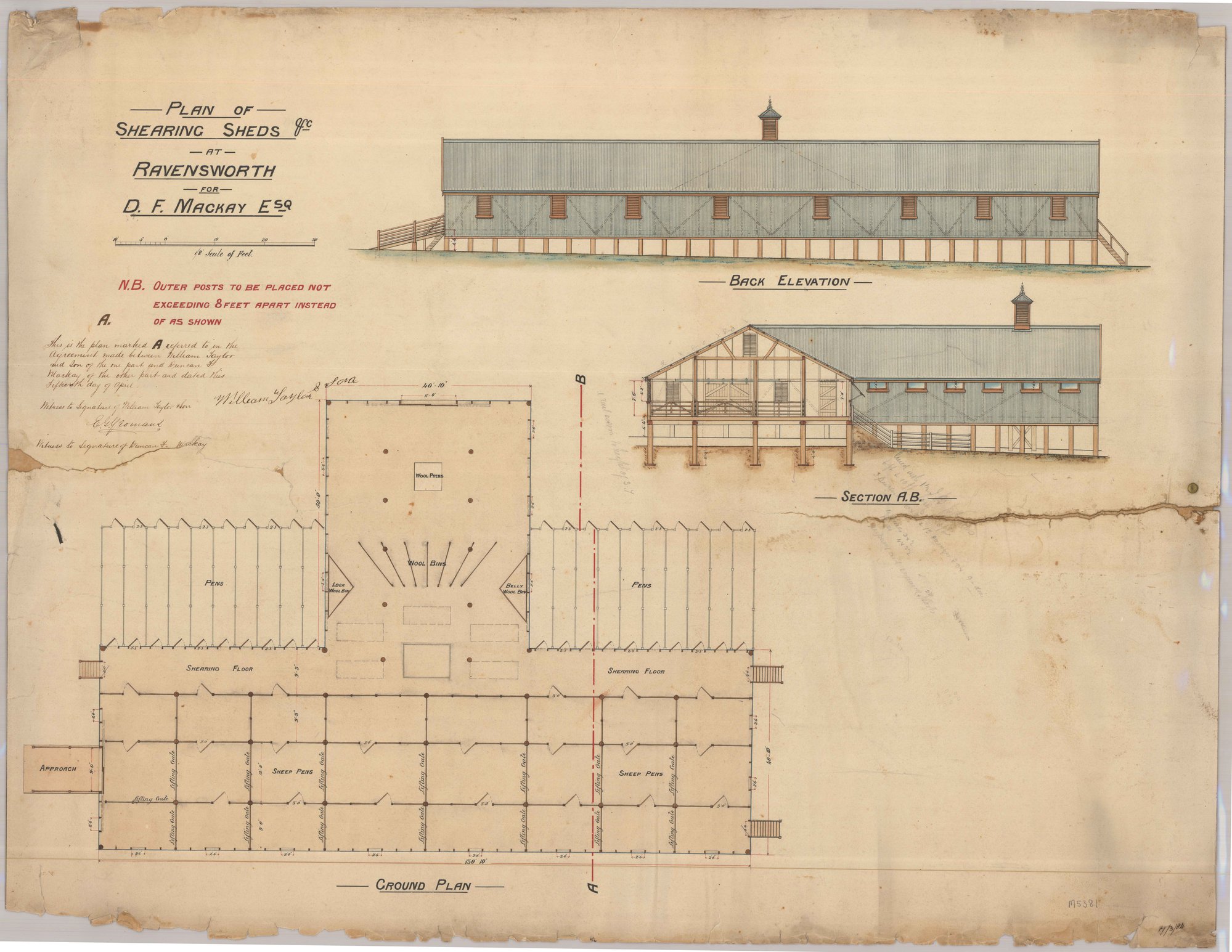 Pender, John Wiltshire, 1833-1917, Plan of Shearing Sheds etc at Ravensworth for D.F.Mackay Esq. [large wool & shearing shed] 15 April 1884 (1884-04-15), [M5381]. Living Histories, accessed 10/03/2026, https://livinghistories.newcastle.edu.au/nodes/view/76672