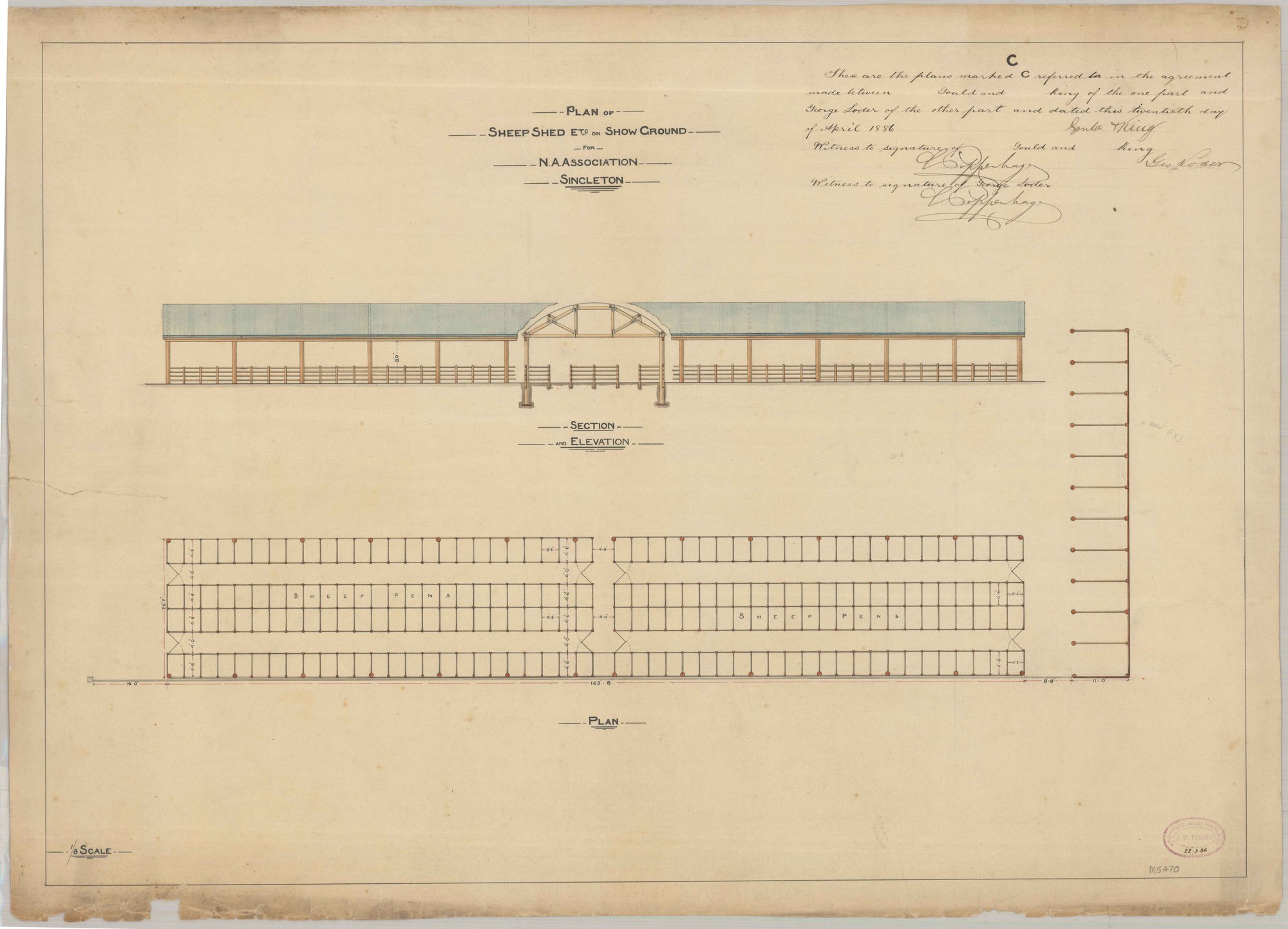 Pender, John Wiltshire, 1833-1917, Plan of Sheep Shed etc on Show Ground for N.A. Association, Singleton, 1886 (1886-03-27), [M5470-1]. Living Histories, accessed 10/03/2026, https://livinghistories.newcastle.edu.au/nodes/view/76677