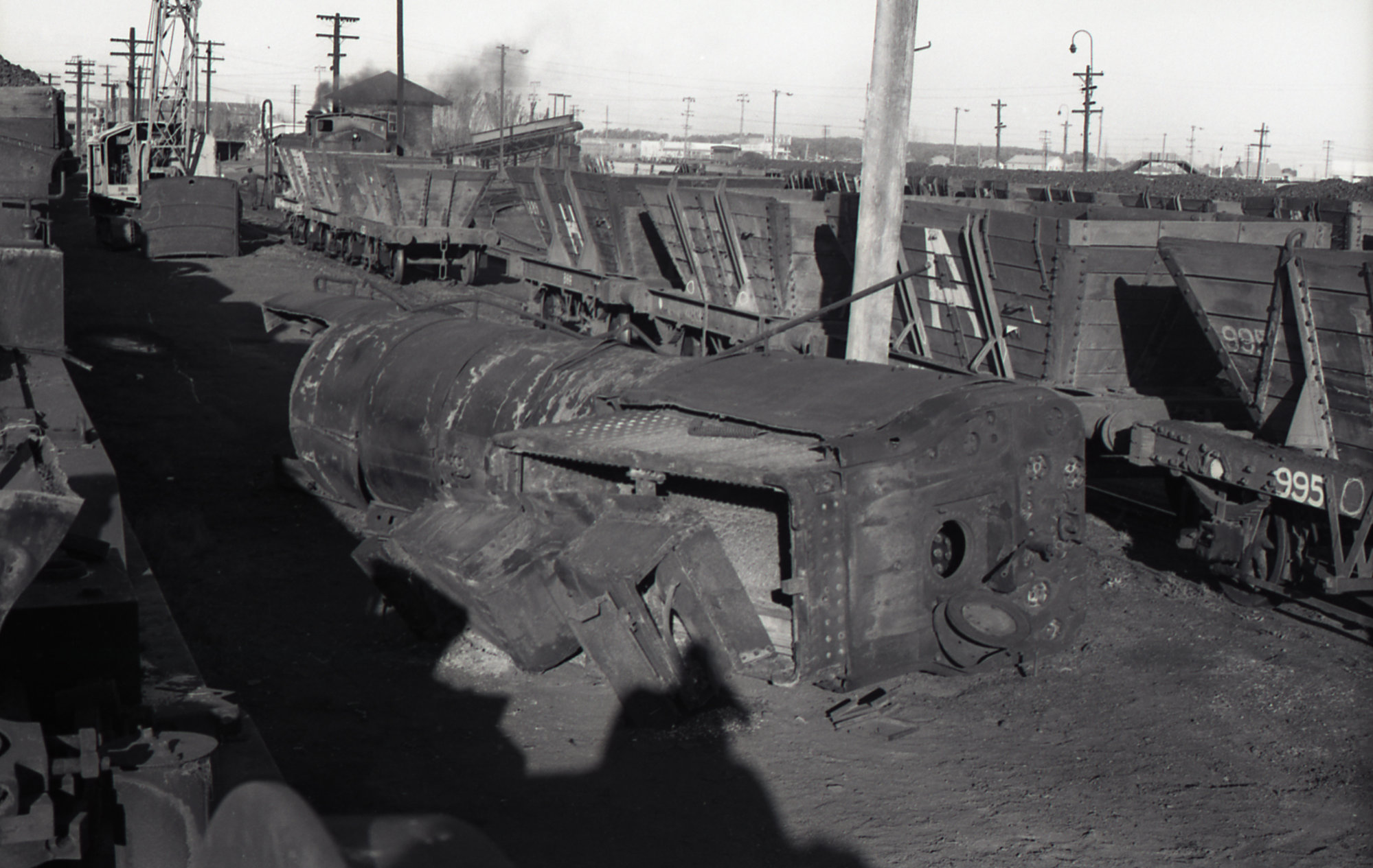 Boiler of ROD 22 on ground, scrapping of RODs at Hexham, 13 September 1973, Richmond Vale Railway