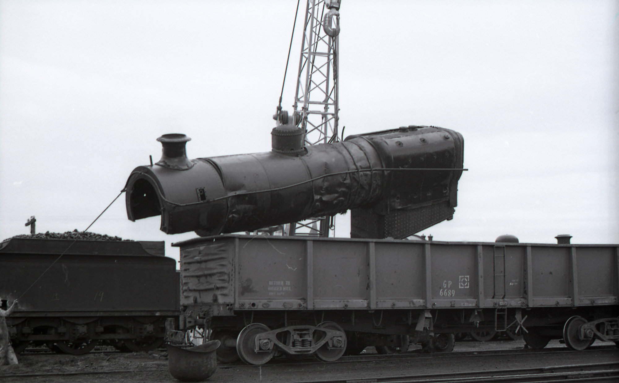 Boiler of ROD 22 being lowered into truck, scrapping of RODs at Hexham, 15 September 1973, Richmond Vale Railway