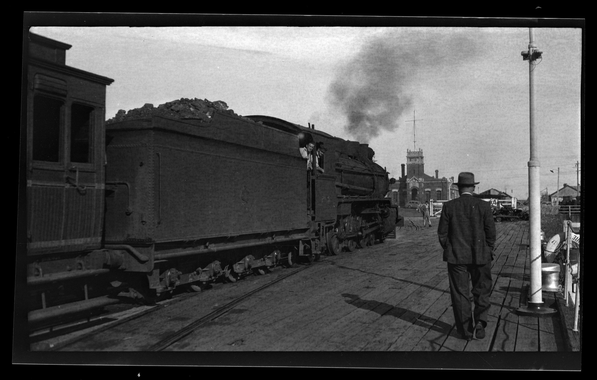 TGR R Class, no. 2, at Burnie, on Ocean Wharf, looking west towards Marine Board building. [n.d.], [ARHSBox112_2773]. Living Histories, accessed 17/02/2026, https://livinghistories.newcastle.edu.au/nodes/view/77024