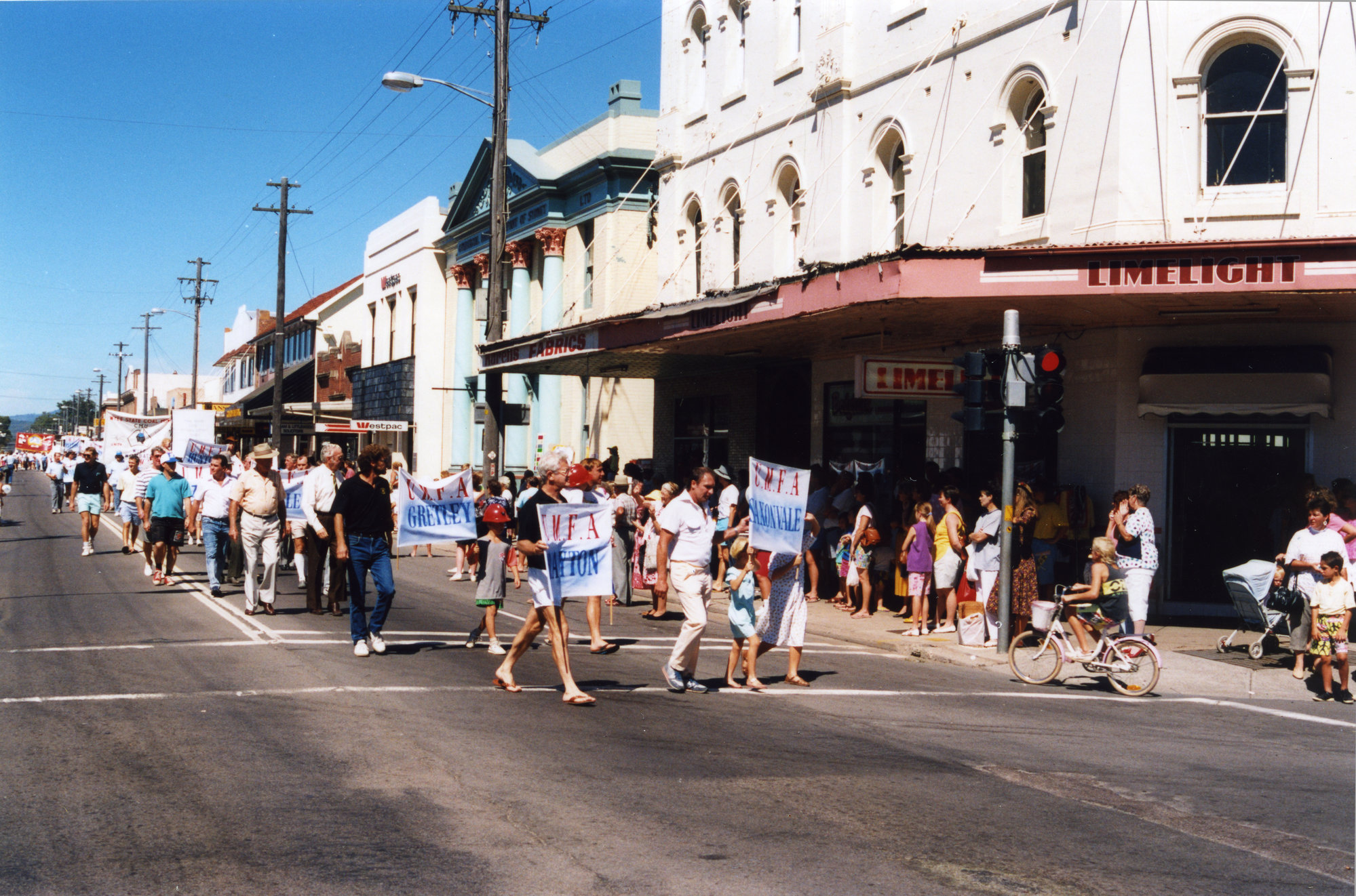 Sternbeck, Percival William, 1921-2004, U.M.F.A. Gretley, Paxton and Saxonvale banners, mineworkers' parade, Vincent Street, Cessnock, NSW, 10 March 1990 (10th March 1990), [Sternbeck_Bk26_199003_010]. Living Histories, accessed 17/01/2026, https://livinghistories.newcastle.edu.au/nodes/view/77645