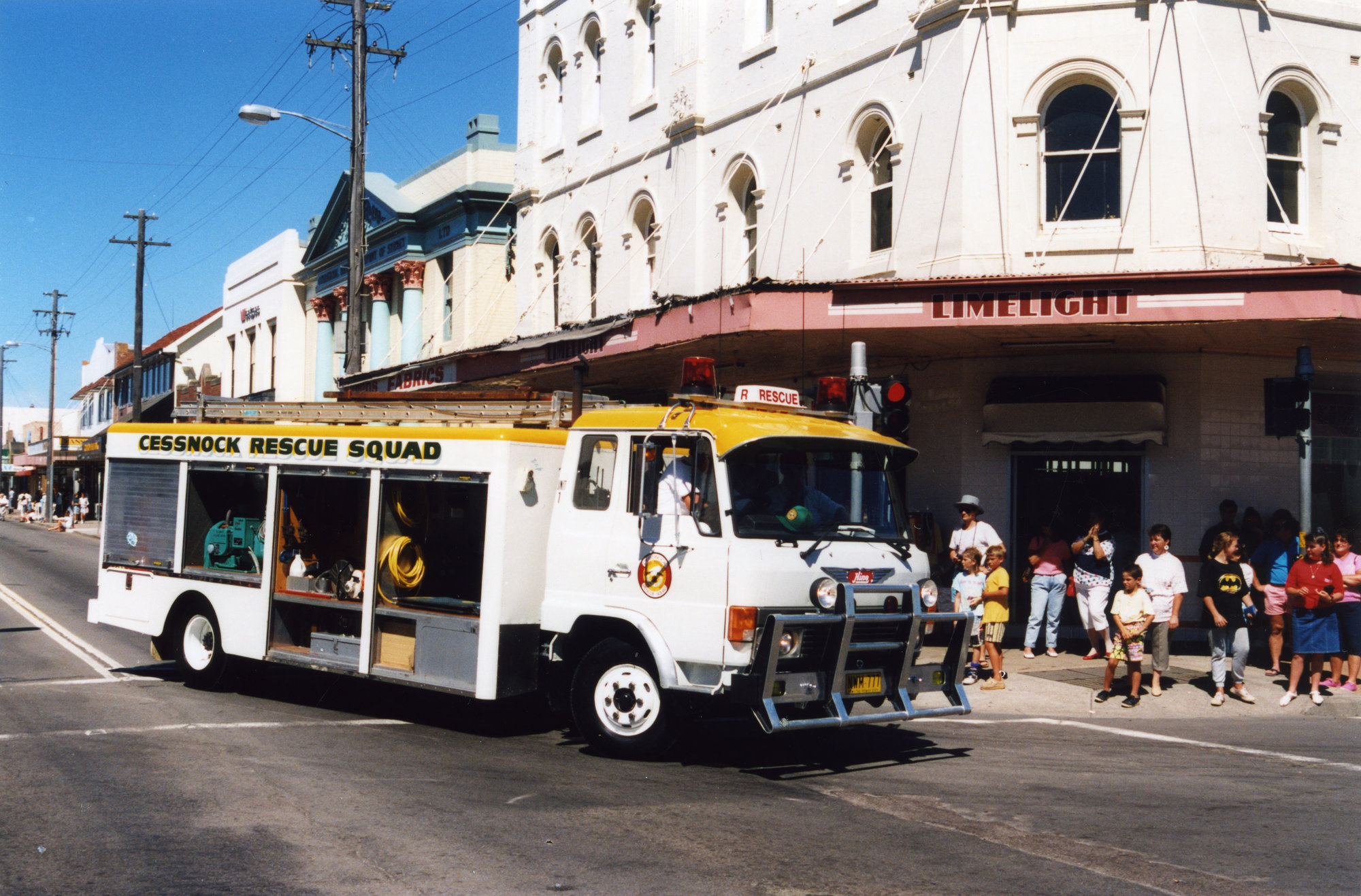 Sternbeck, Percival William, 1921-2004, Cessnock Rescue Squad vehicle in mineworkers' parade, Vincent Street, Cessnock, NSW, 10 March 1990 (10th March 1990), [Sternbeck_Bk26_199003_020]. Living Histories, accessed 11/03/2026, https://livinghistories.newcastle.edu.au/nodes/view/77654
