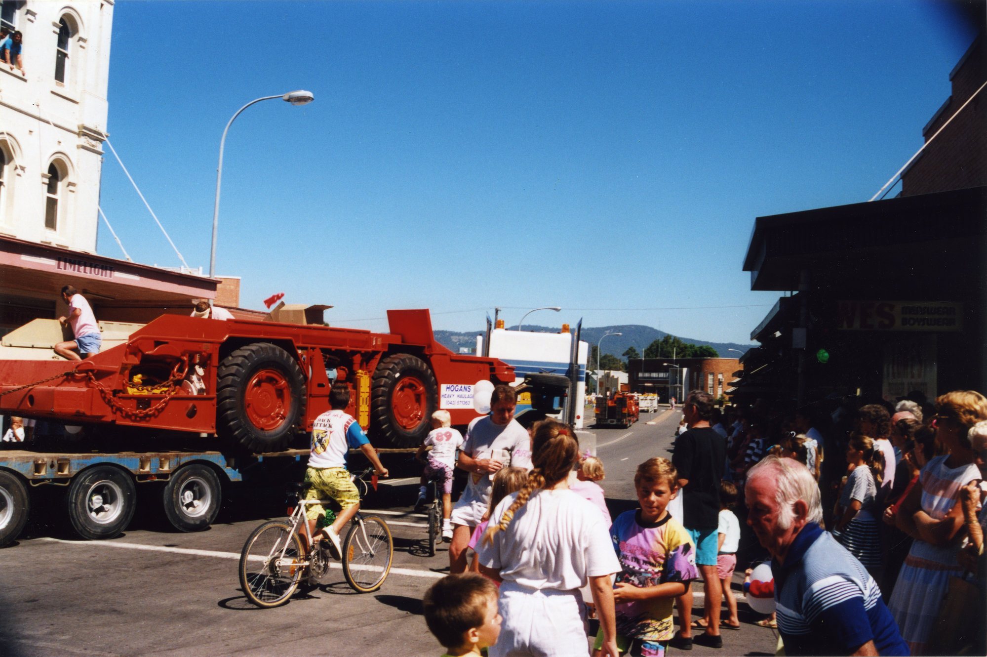 Sternbeck, Percival William, 1921-2004, Hogan's Heavy Haulage truck, mineworkers' parade, Vincent Street, Cessnock, NSW, 10 March 1990 (10th March 1990), [Sternbeck_Bk26_199003_024]. Living Histories, accessed 13/02/2026, https://livinghistories.newcastle.edu.au/nodes/view/77658