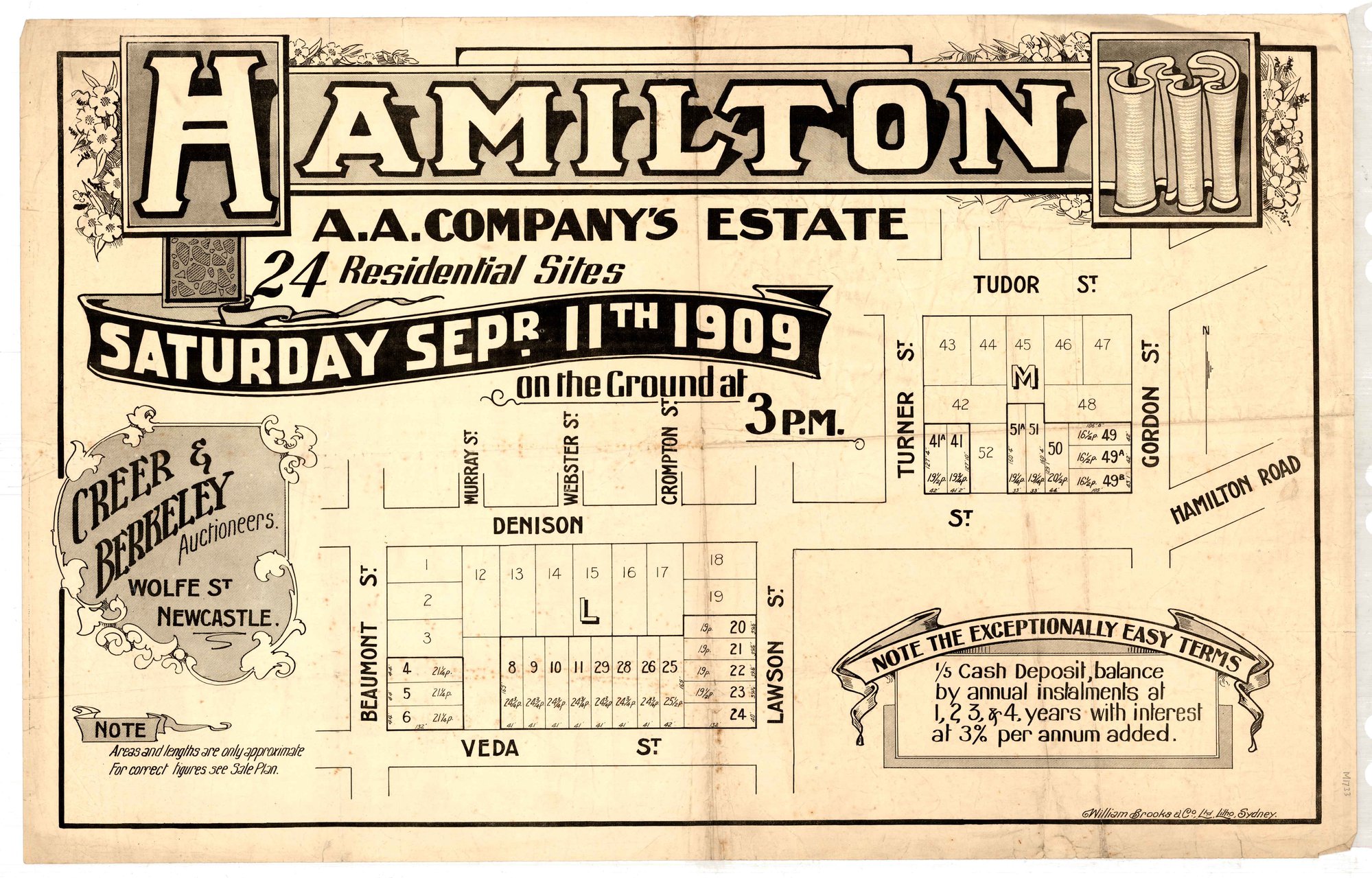 Hamilton, A.A. Company's Estate. Saturday 11th September, 1909. (1909-09-11), [M1733]. Living Histories, accessed 25/01/2026, https://livinghistories.newcastle.edu.au/nodes/view/77956