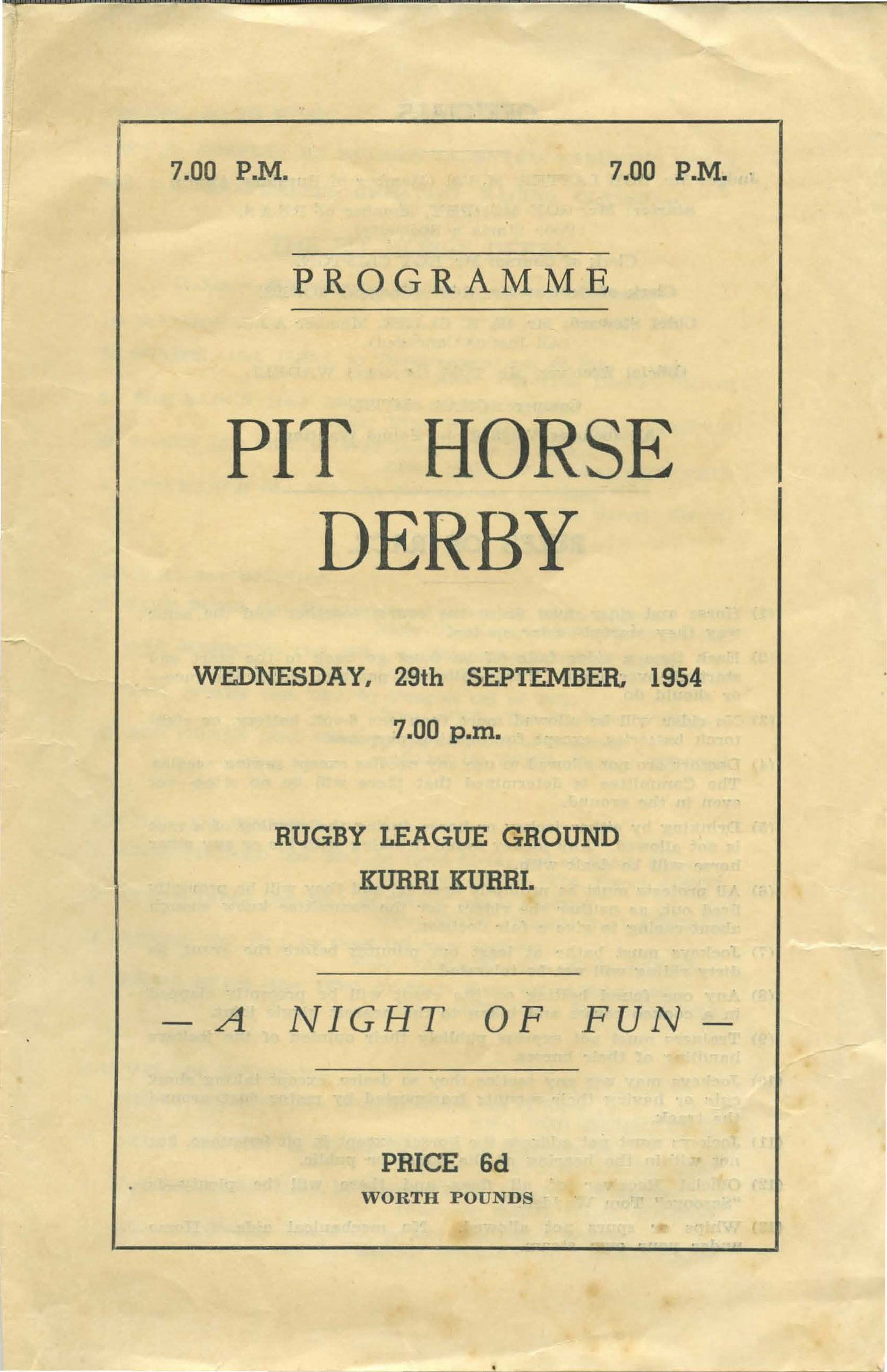 Programme - Pit Horse Derby, Wednesday 29th September 1954, 7.00 pm. Rugby League Ground, Kurri Kurri. A night of fun