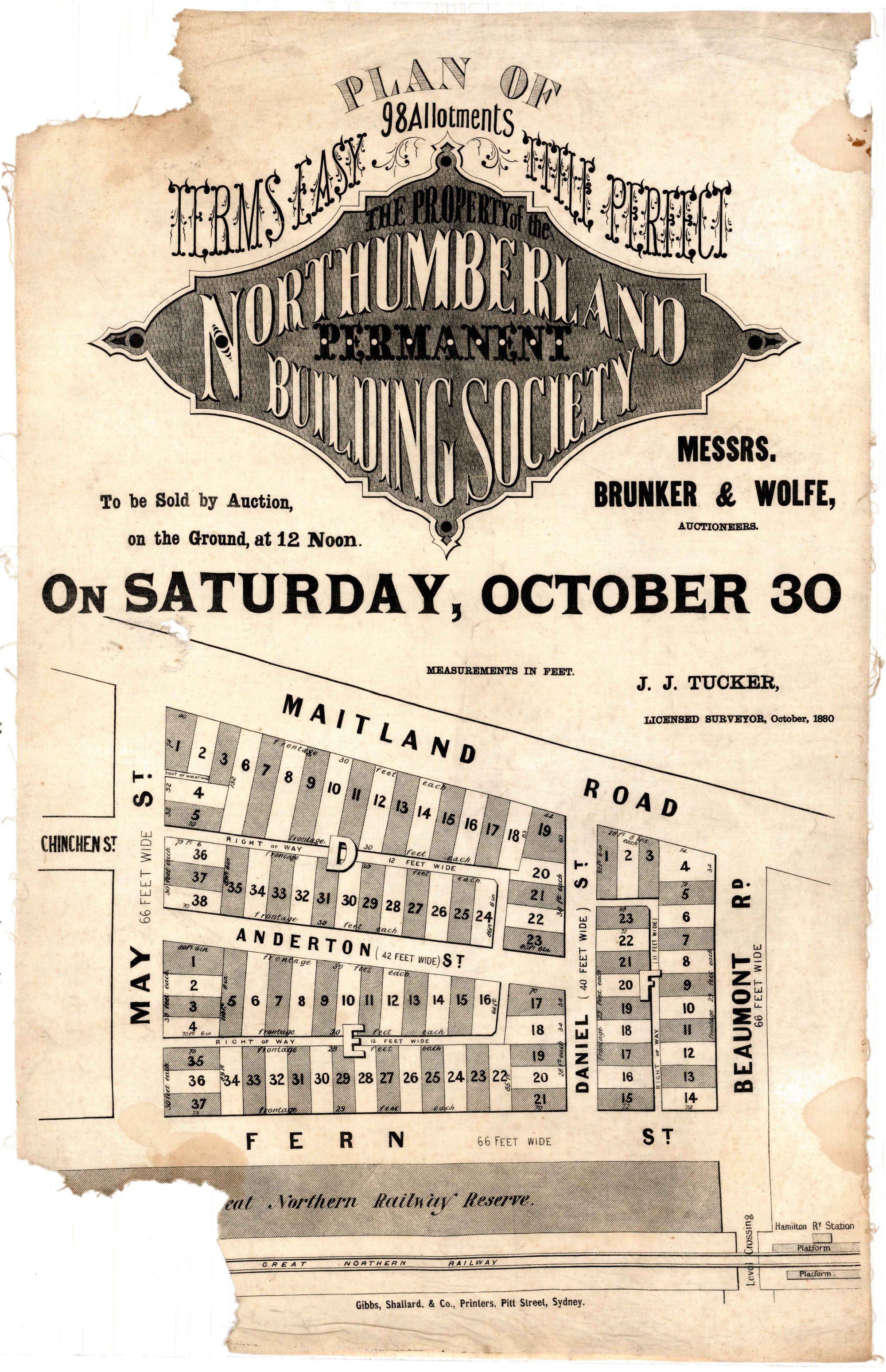 J.J. Tucker, Plan of 98 allotments, Islington Township & Hamilton 1880. (1880), [M3001]. Living Histories, accessed 22/01/2026, https://livinghistories.newcastle.edu.au/nodes/view/78330