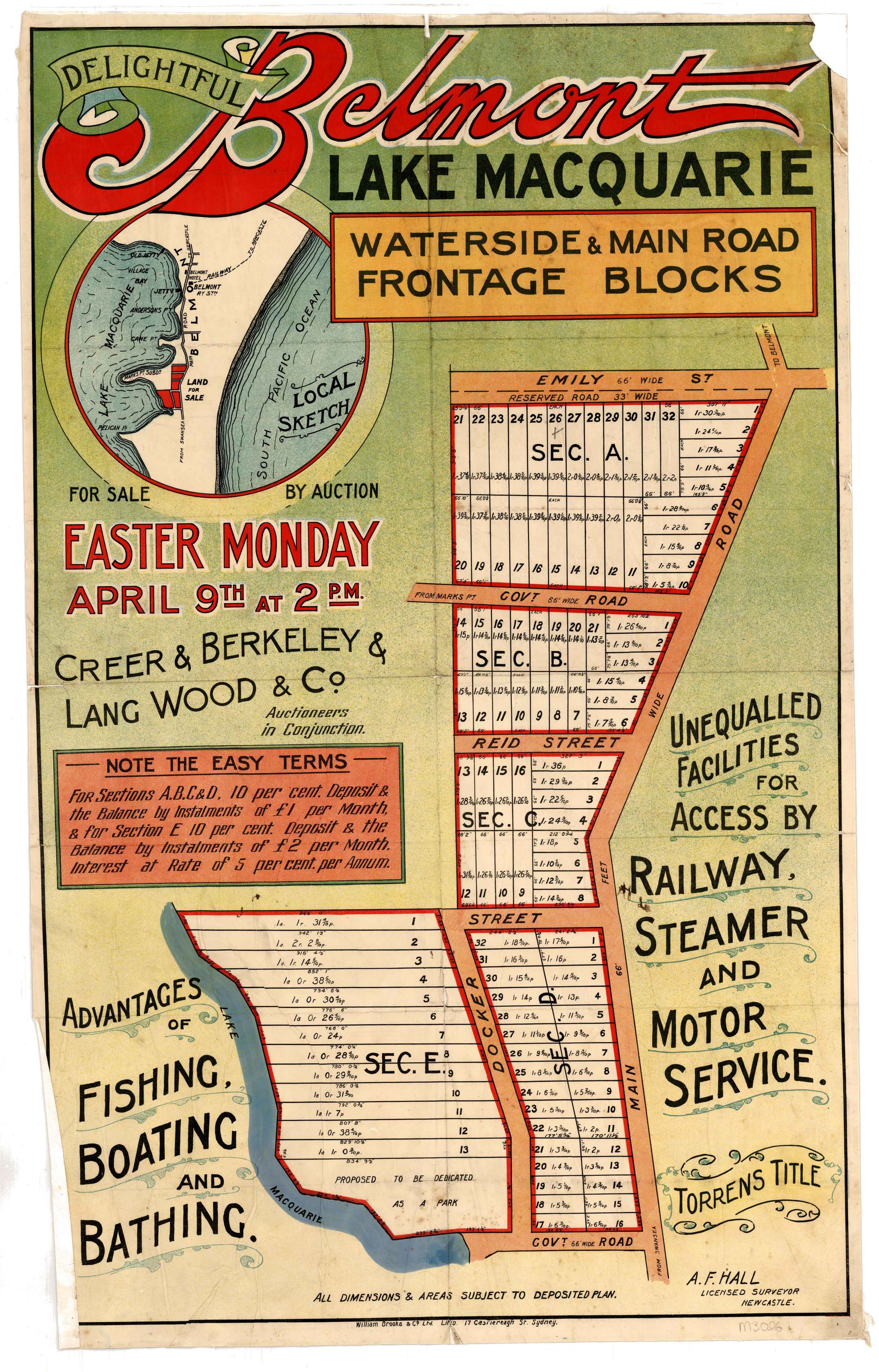 Belmont (now Marks Point), Lake Macquarie subdivision plan, Easter Monday 9th April [n.d]., [M3026]. Living Histories, accessed 08/03/2026, https://livinghistories.newcastle.edu.au/nodes/view/78348