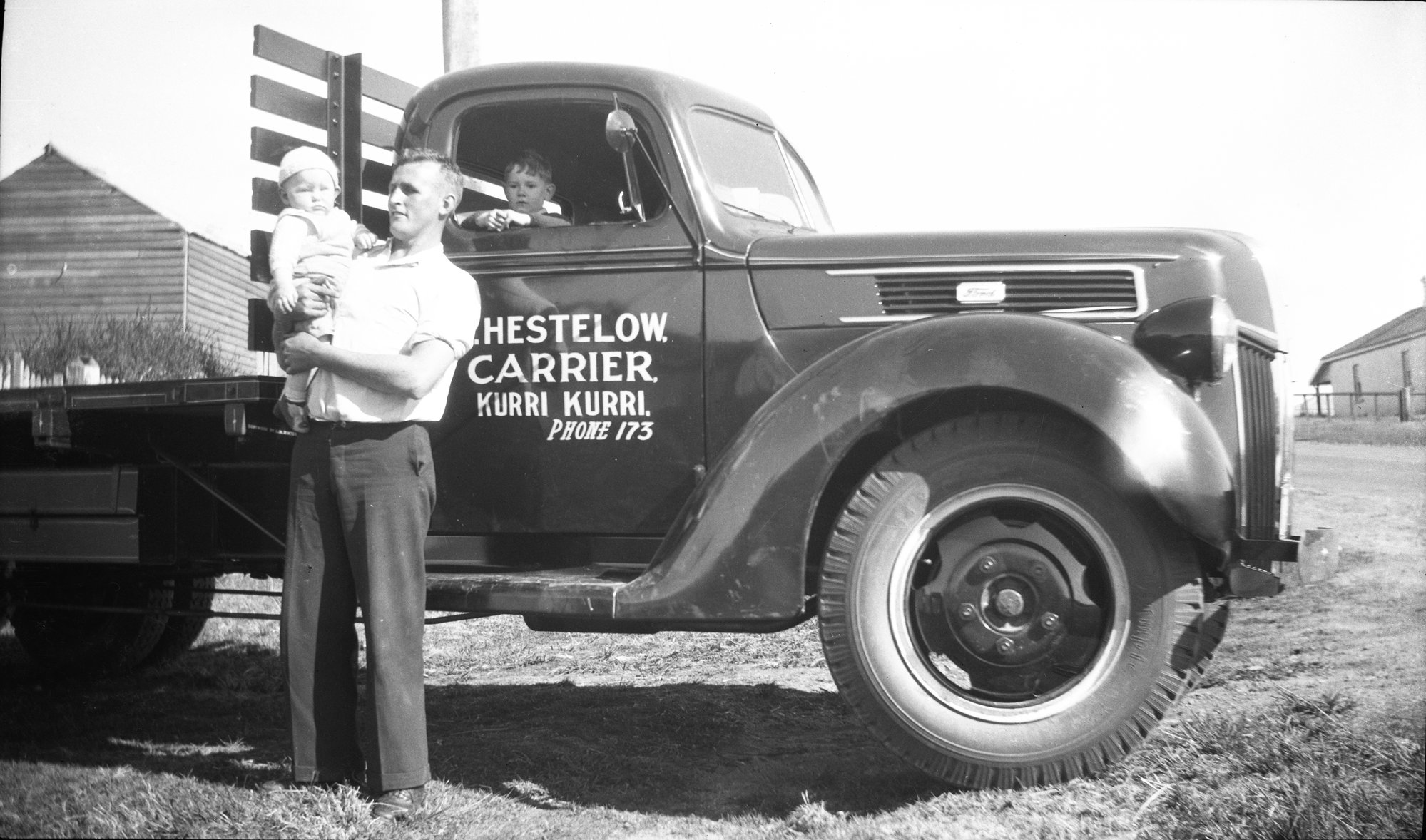 Lindsay (Charlie Snr) Cook holding his son Charles (Charlie) Cook, and John Blundell pictured with Charlie Snr's Ford work truck owned by B. Hestelow, Carrier, Kurri Kurri, 1941 (1941), [OL_Cook_001]. Living Histories, accessed 20/03/2026, https://livinghistories.newcastle.edu.au/nodes/view/78641