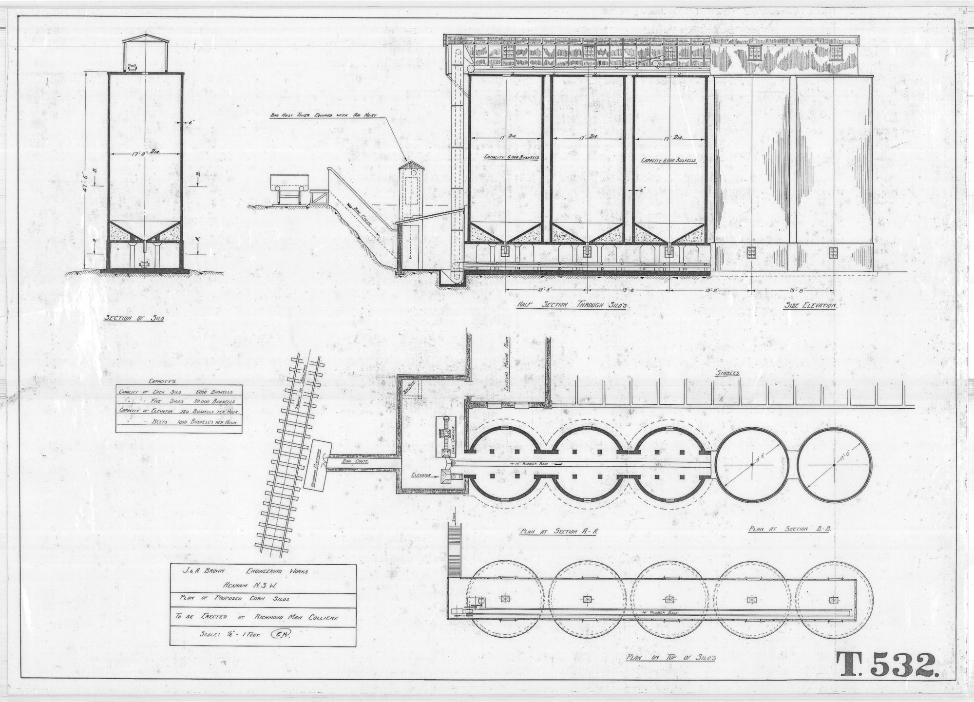 Plan of proposed corn silos to be erected at Richmond Main Colliery, [RVMM_T532]. Living Histories, accessed 14/01/2026, https://livinghistories.newcastle.edu.au/nodes/view/78717