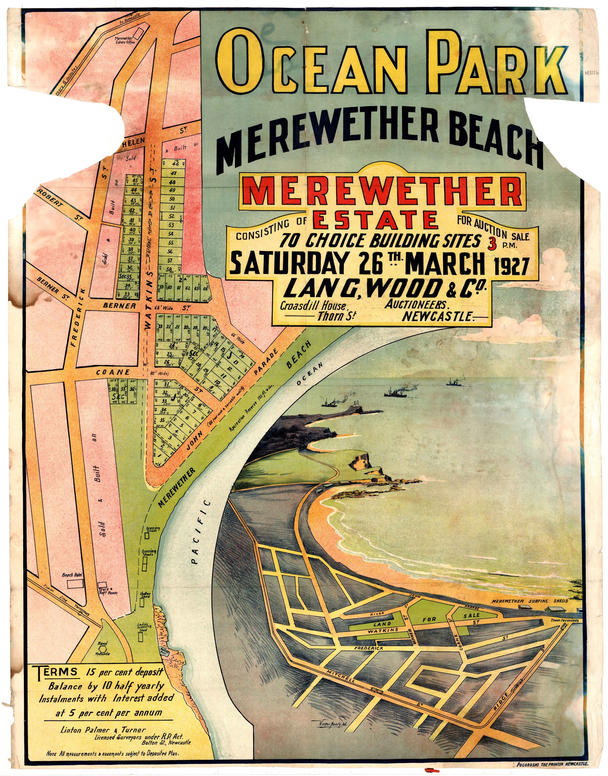Linton Palmer & Turner, Ocean Park, Merewether Beach, Merewether Estate, Saturday, 26 March, 1927 (26th March 1927), [M3256]. Living Histories, accessed 30/03/2026, https://livinghistories.newcastle.edu.au/nodes/view/78777