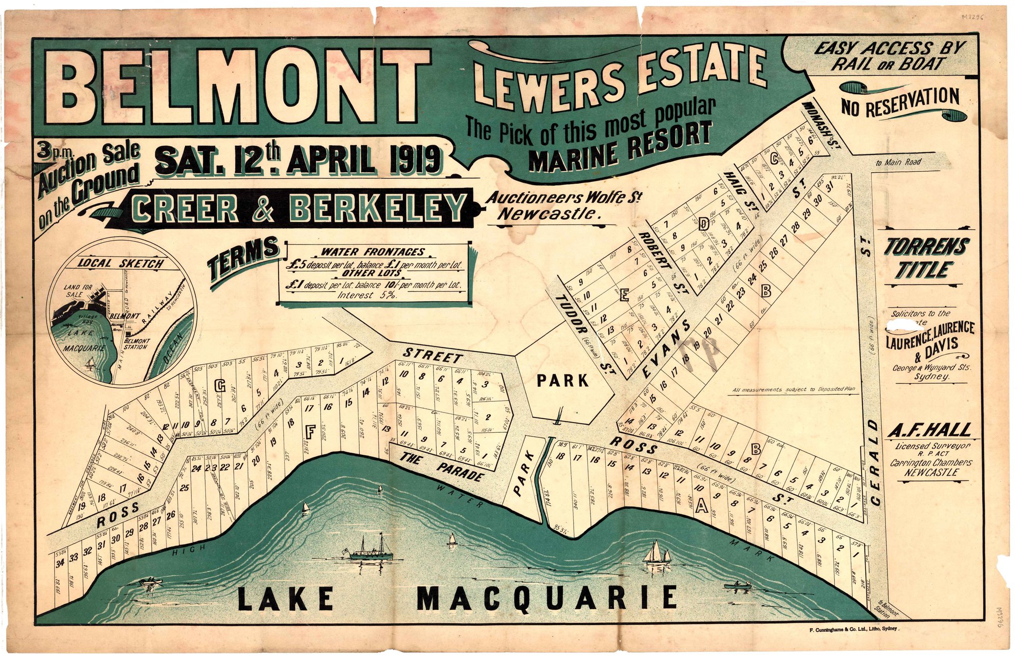 Hall, Alfred Francis, 1859-1937, Belmont, Lewers Estate Subdivision Plan, Saturday 12th April, 1919. (12th April 1919), [M3296]. Living Histories, accessed 19/03/2026, https://livinghistories.newcastle.edu.au/nodes/view/78870