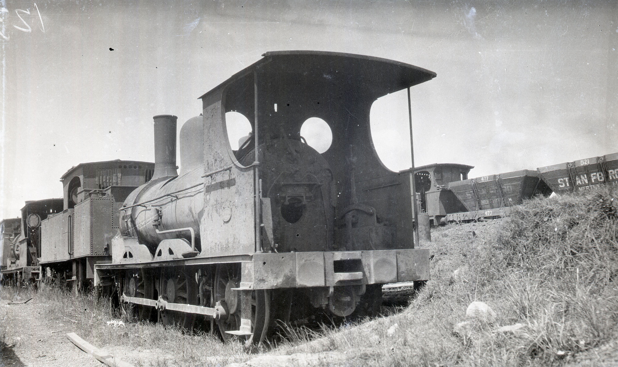 SMR Pty Ltd, Locomotive "New England" detached from tender and (ex-NSWGR CC-79 Class), Mount Dee sidings, [1930s] ([1930s]), [ARHSBox011_0311]. Living Histories, accessed 13/01/2026, https://livinghistories.newcastle.edu.au/nodes/view/7893