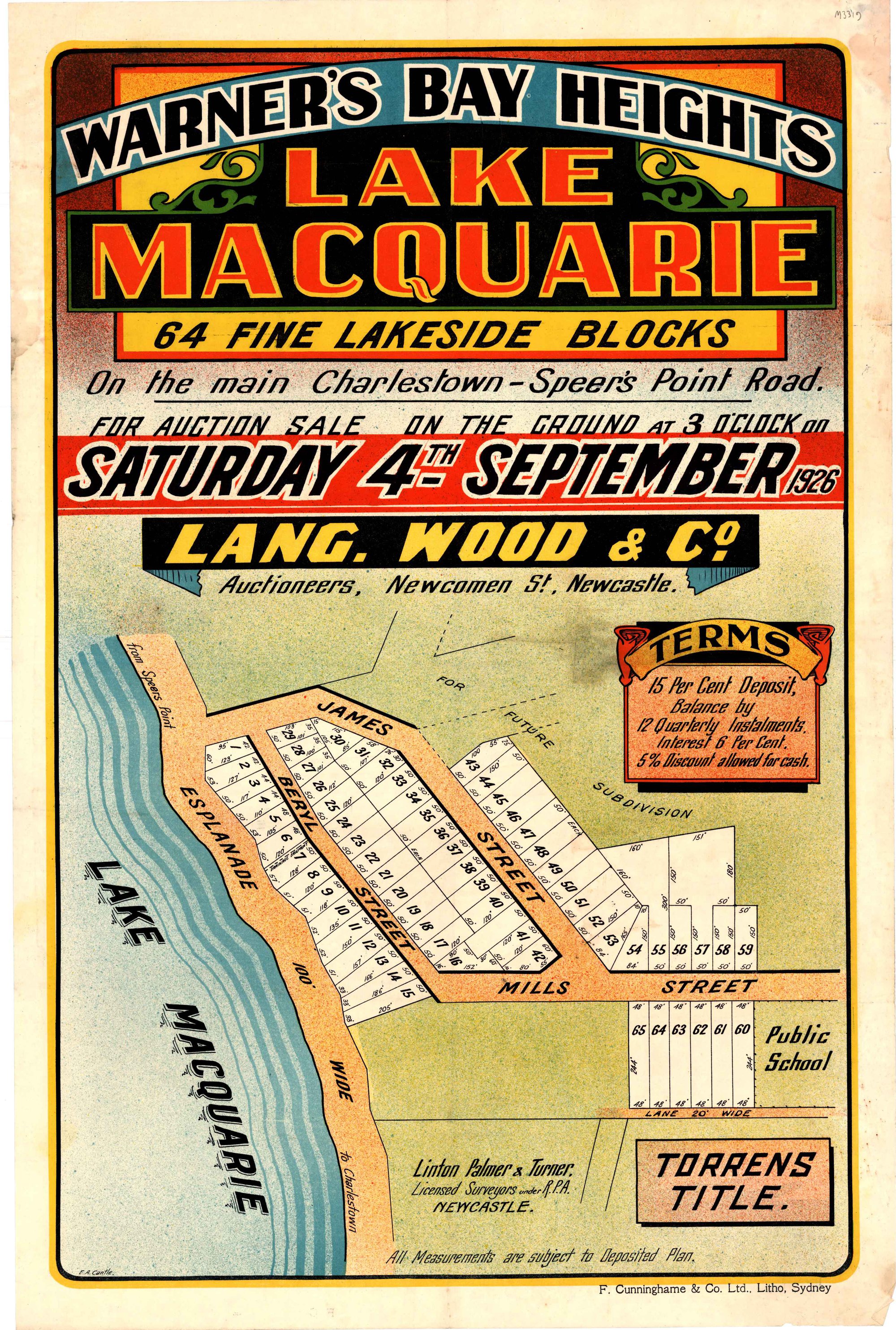 Linton Palmer & Turner, Warners Bay Heights Subdivision Plan, Lake Macquarie, Saturday 4th September, 1926. (4th September 1926), [M3319]. Living Histories, accessed 18/01/2026, https://livinghistories.newcastle.edu.au/nodes/view/78971
