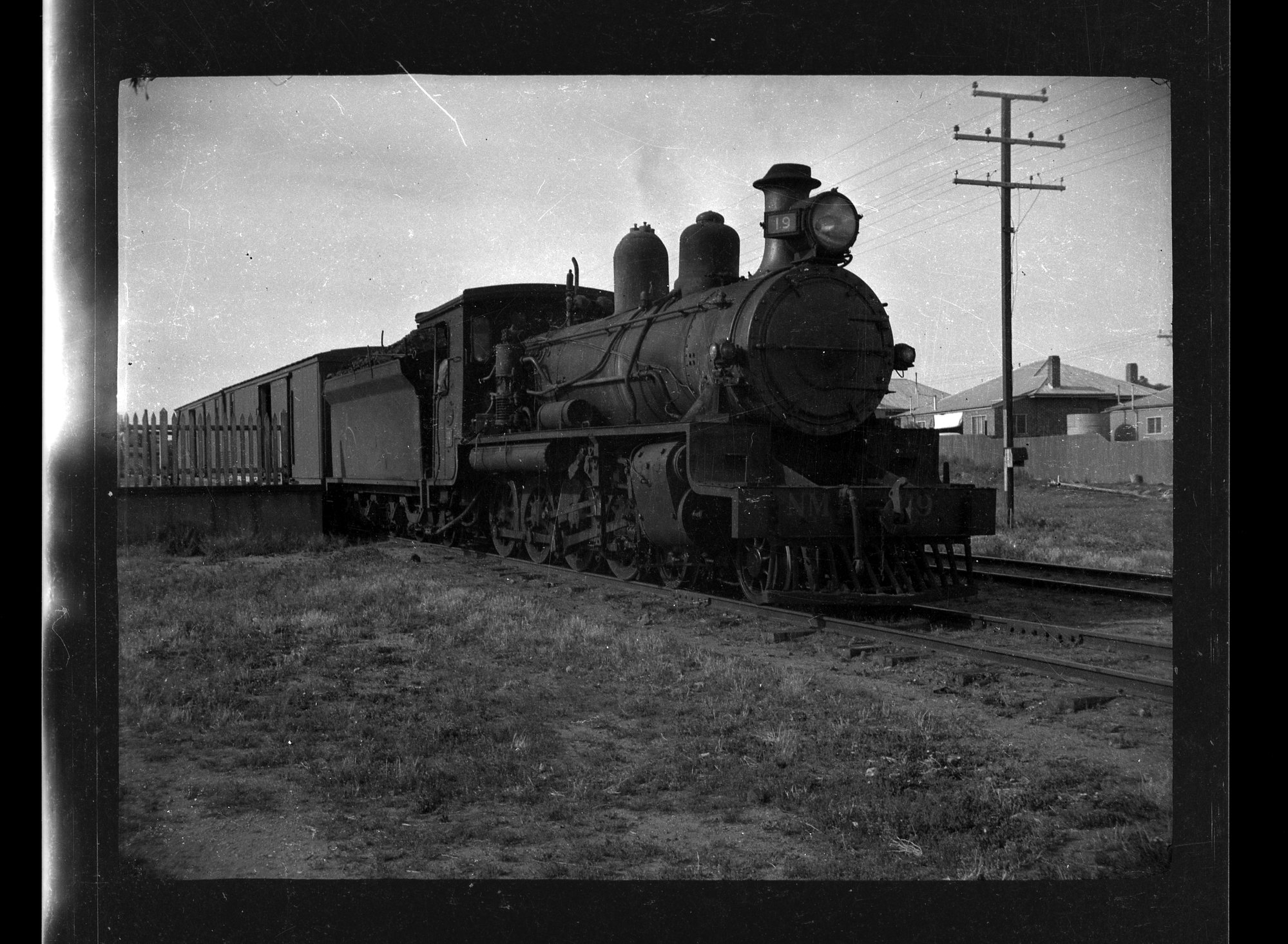 Commonwealth Railways, 3'6" gauge NM class, 4-8-0, no 19, with unidentified crewman, Port Augusta Railway Station, 1 of 3, [n.d.]