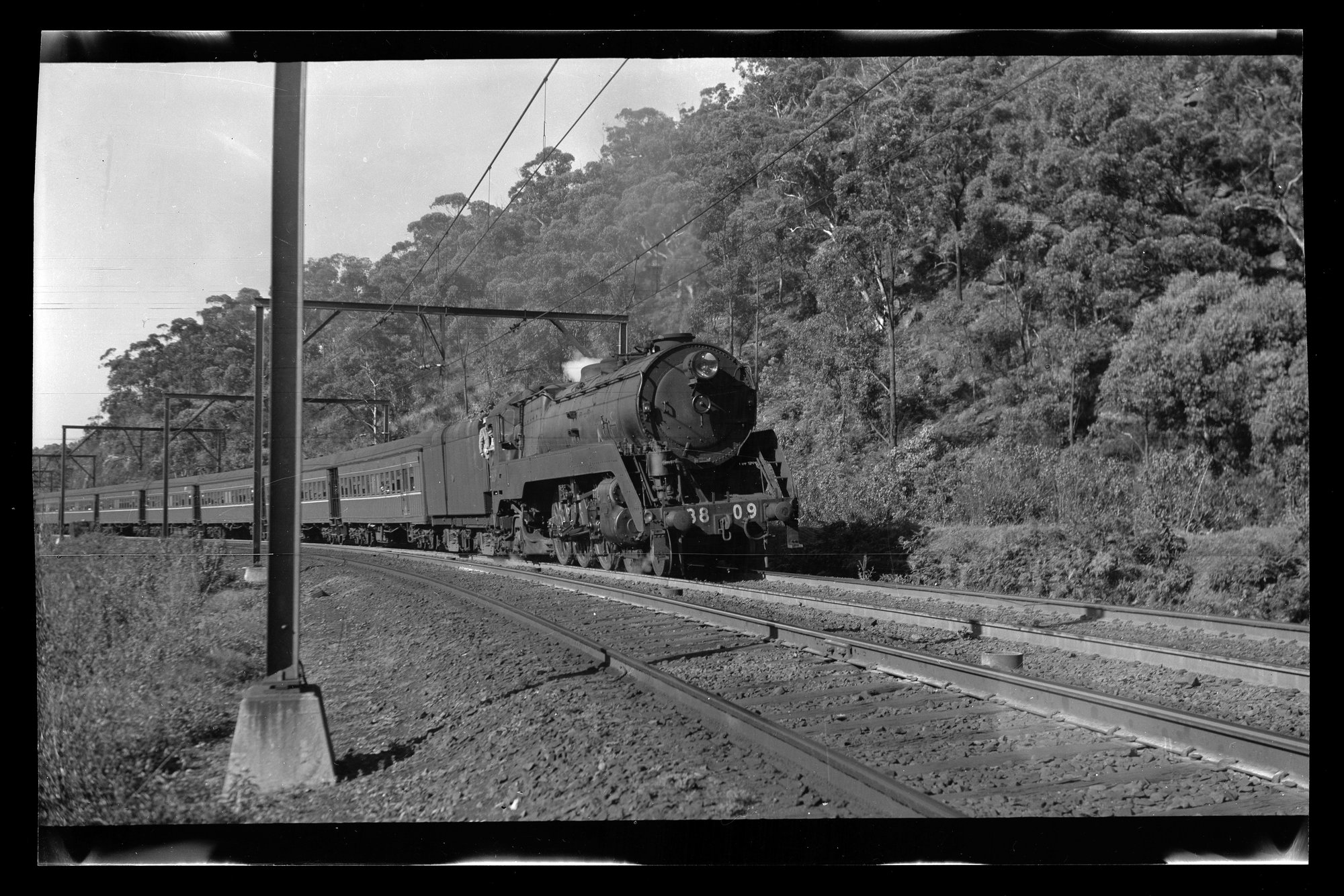 NSWGR C38 Class locomotive, No. 3809, unidentified location, [n.d.], [ARHSBox075_2083]. Living Histories, accessed 17/04/2026, https://livinghistories.newcastle.edu.au/nodes/view/79591