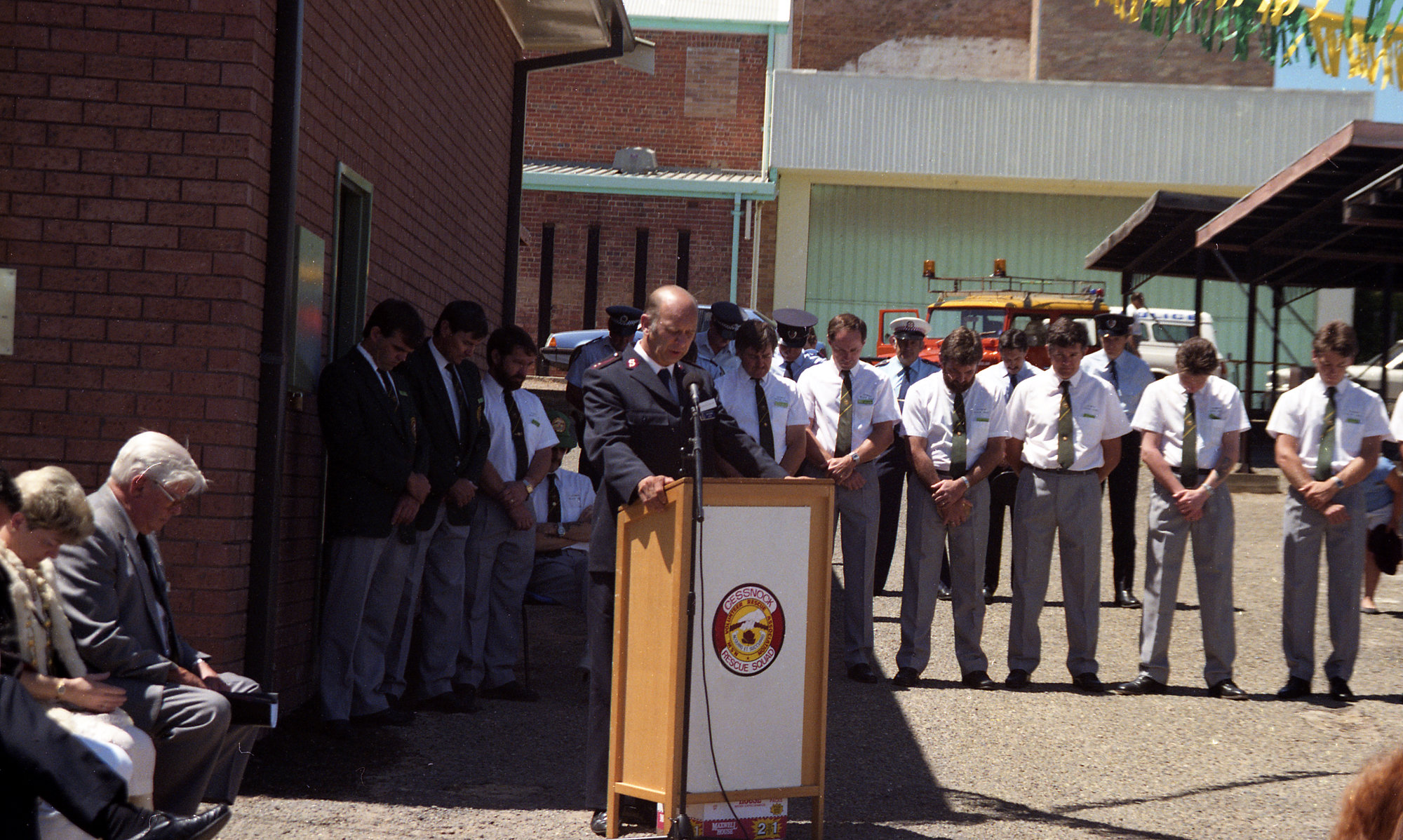 Salvation Army Officer leading prayer at the opening of the Kurri Kurri Rescue Squad building, 24 November 1990