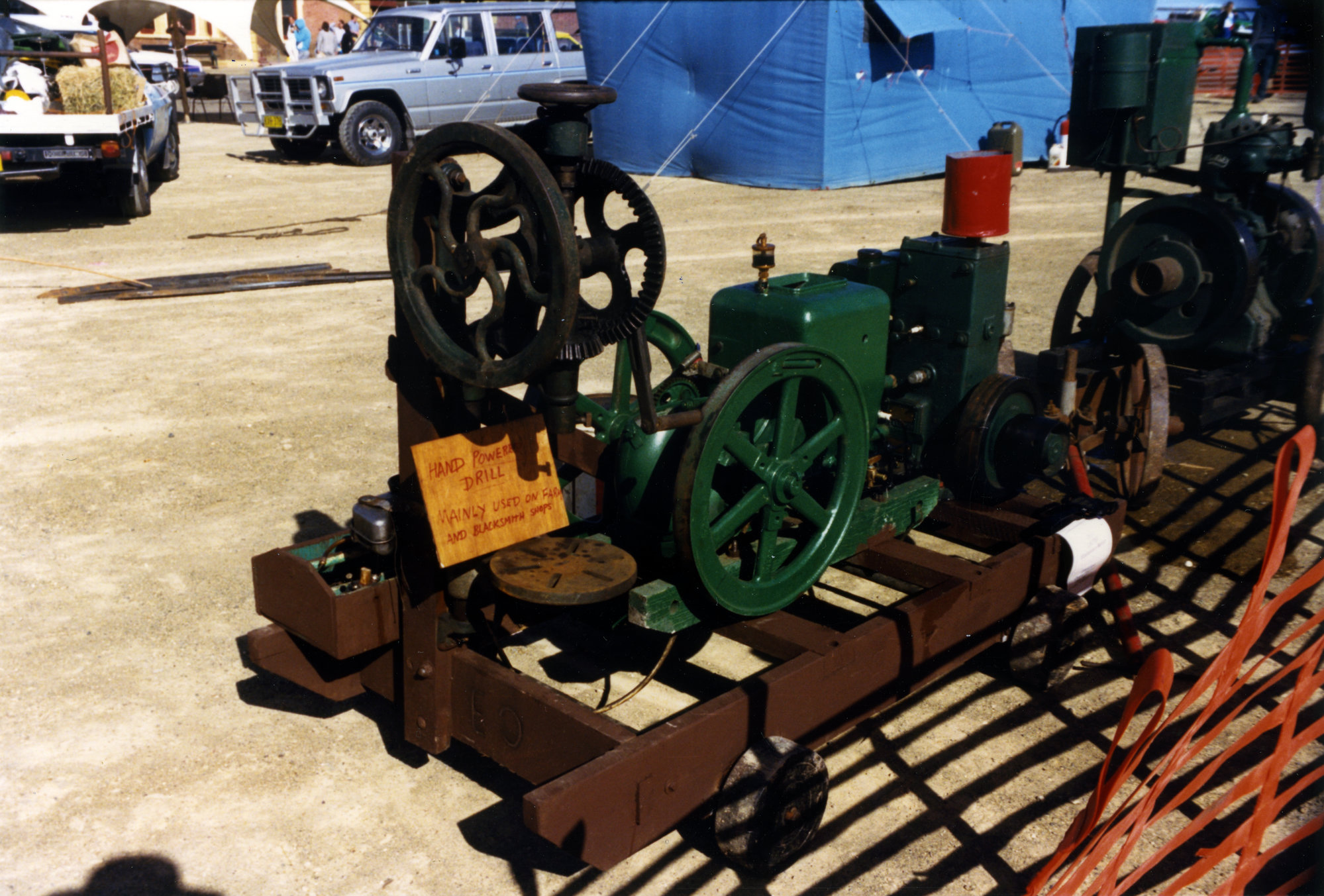 Sternbeck, Percival William, 1921-2004, Hand powered drill, mainly used on farms and blacksmiths' shops - Steamfest, Maitland Station, Maitland, NSW, April 1990 (Between 1st April 1990 and 30th April 1990), [Sternbeck_Bk27_0490C_006_1]. Living Histories, accessed 18/03/2026, https://livinghistories.newcastle.edu.au/nodes/view/80098