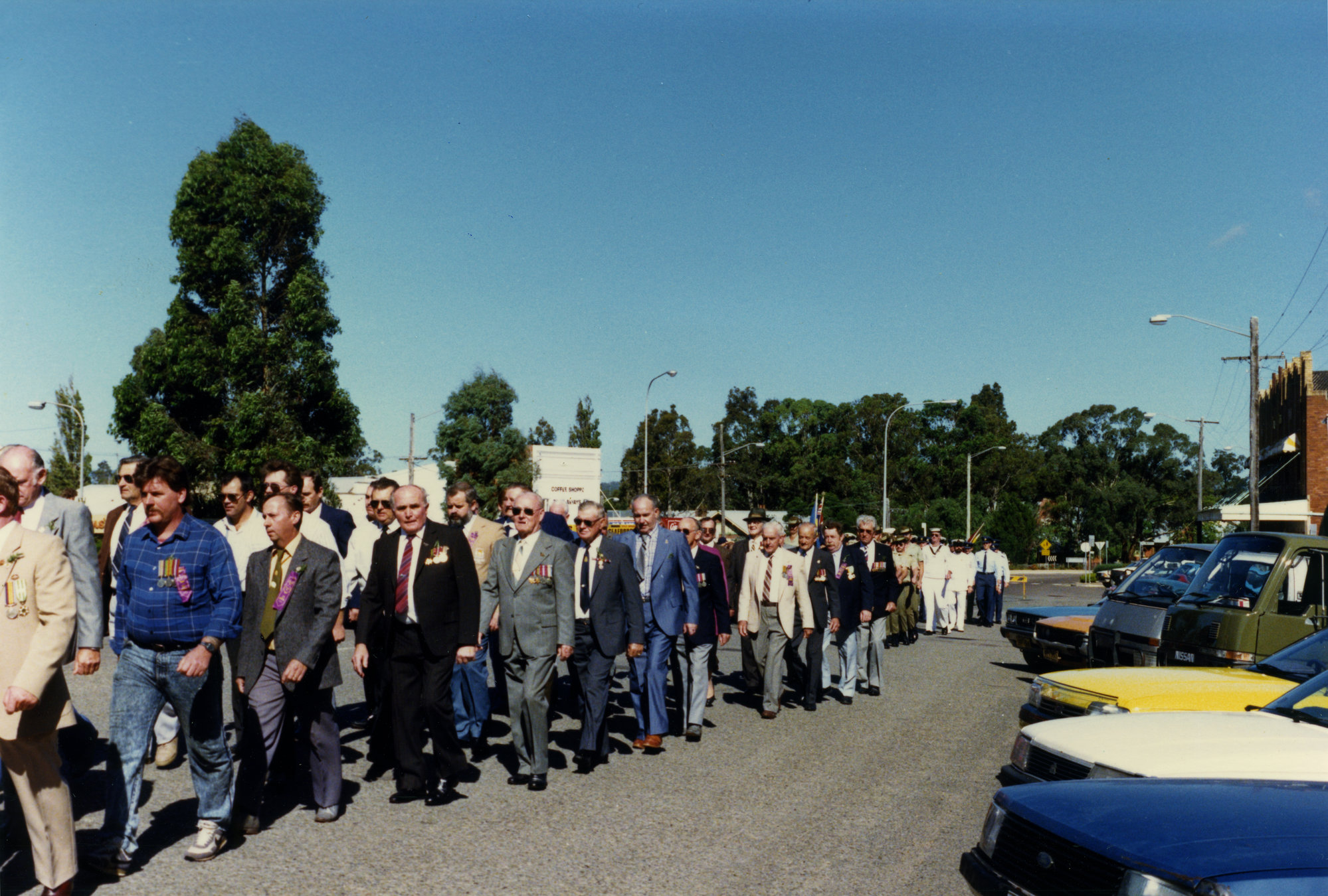 Sternbeck, Percival William, 1921-2004, Veterans in ANZAC Day March, Kurri Kurri, NSW, 25 April 1990 (25th April 1990), [Sternbeck_Bk27_0490A_011]. Living Histories, accessed 16/02/2026, https://livinghistories.newcastle.edu.au/nodes/view/80134
