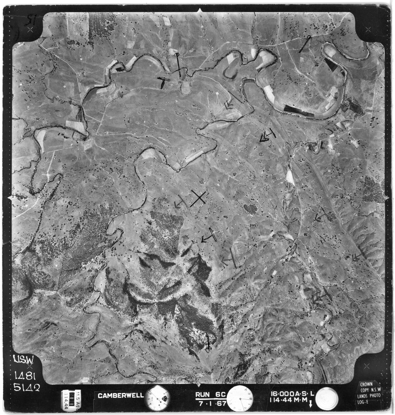 New South Wales. Department of Lands, Camberwell, NSW - Aerial photograph, January 1967 (5142) (7th January 1967), [CAMBERWELL-01-1967-R006C-1481-5142]. Living Histories, accessed 19/03/2026, https://livinghistories.newcastle.edu.au/nodes/view/80274
