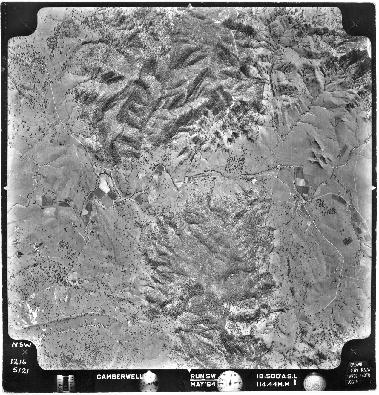 New South Wales. Department of Lands, Camberwell, NSW - Aerial photograph, May 1964 (5121) (1964-05), [CAMBERWELL-05-1964-R005W-1216-5121]. Living Histories, accessed 18/03/2026, https://livinghistories.newcastle.edu.au/nodes/view/80375