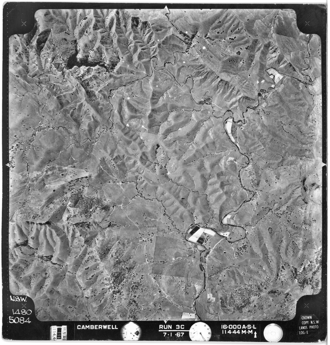 New South Wales. Department of Lands, Camberwell, NSW - Aerial photograph, January 1967 (5084) (7th January 1967), [CAMBERWELL-01-1967-R003C-1480-5084]. Living Histories, accessed 24/01/2026, https://livinghistories.newcastle.edu.au/nodes/view/80465