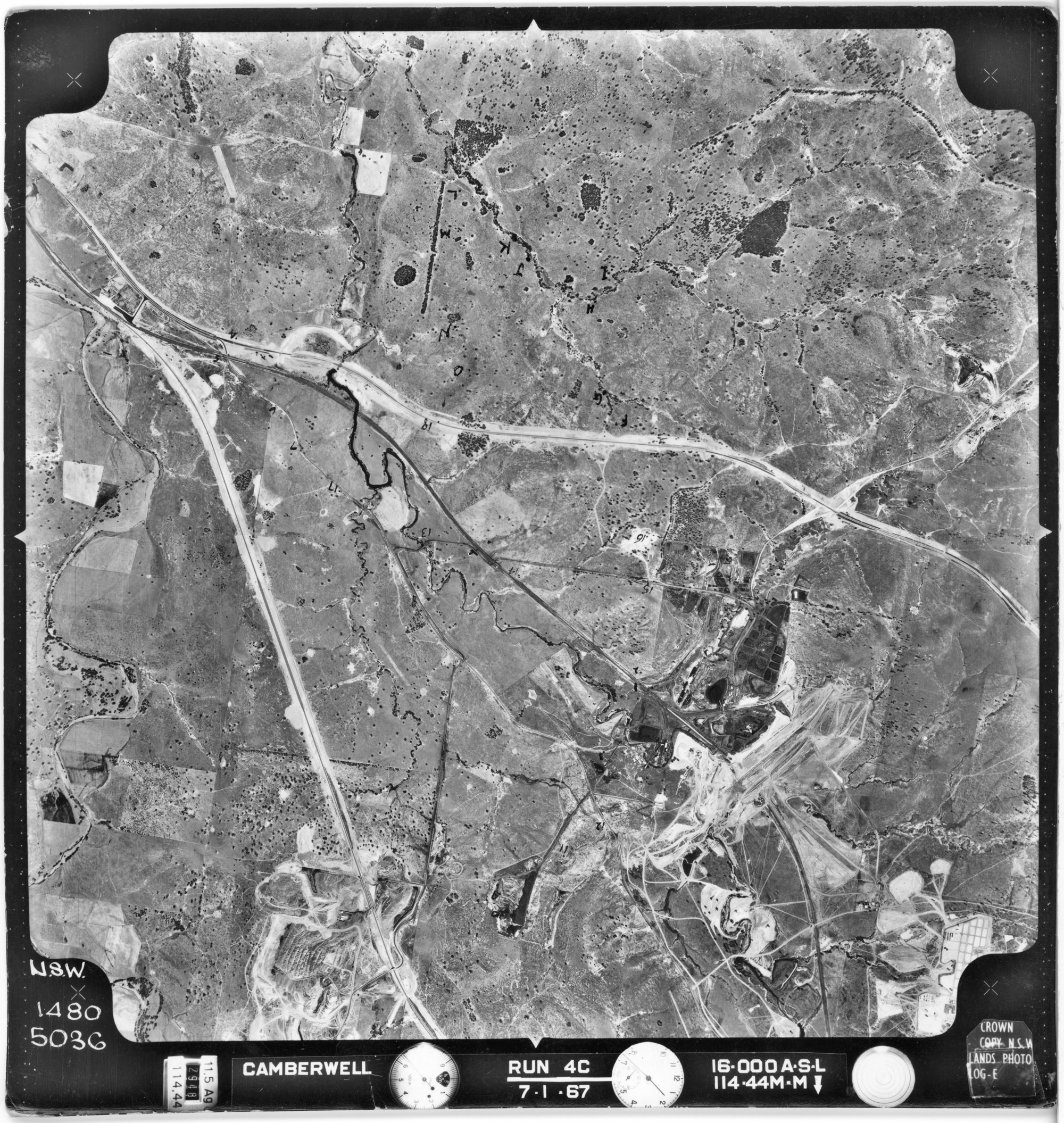 New South Wales. Department of Lands, Camberwell, NSW - Aerial photograph, January 1967 (5036) (7th January 1967), [CAMBERWELL-01-1967-R004C-1480-5036]. Living Histories, accessed 11/03/2026, https://livinghistories.newcastle.edu.au/nodes/view/80497