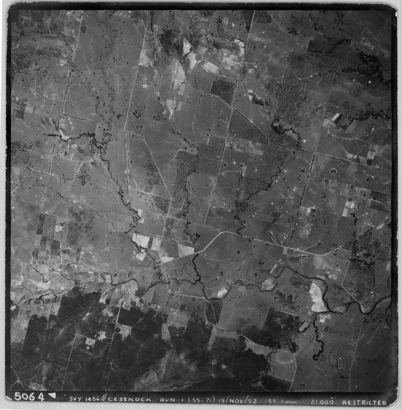 New South Wales. Department of Lands, Cessnock, NSW - Aerial photograph, November 1952 (5064) (19th November 1952), [CESSNOCK-11-1952-R001-1456-5064]. Living Histories, accessed 19/03/2026, https://livinghistories.newcastle.edu.au/nodes/view/80506