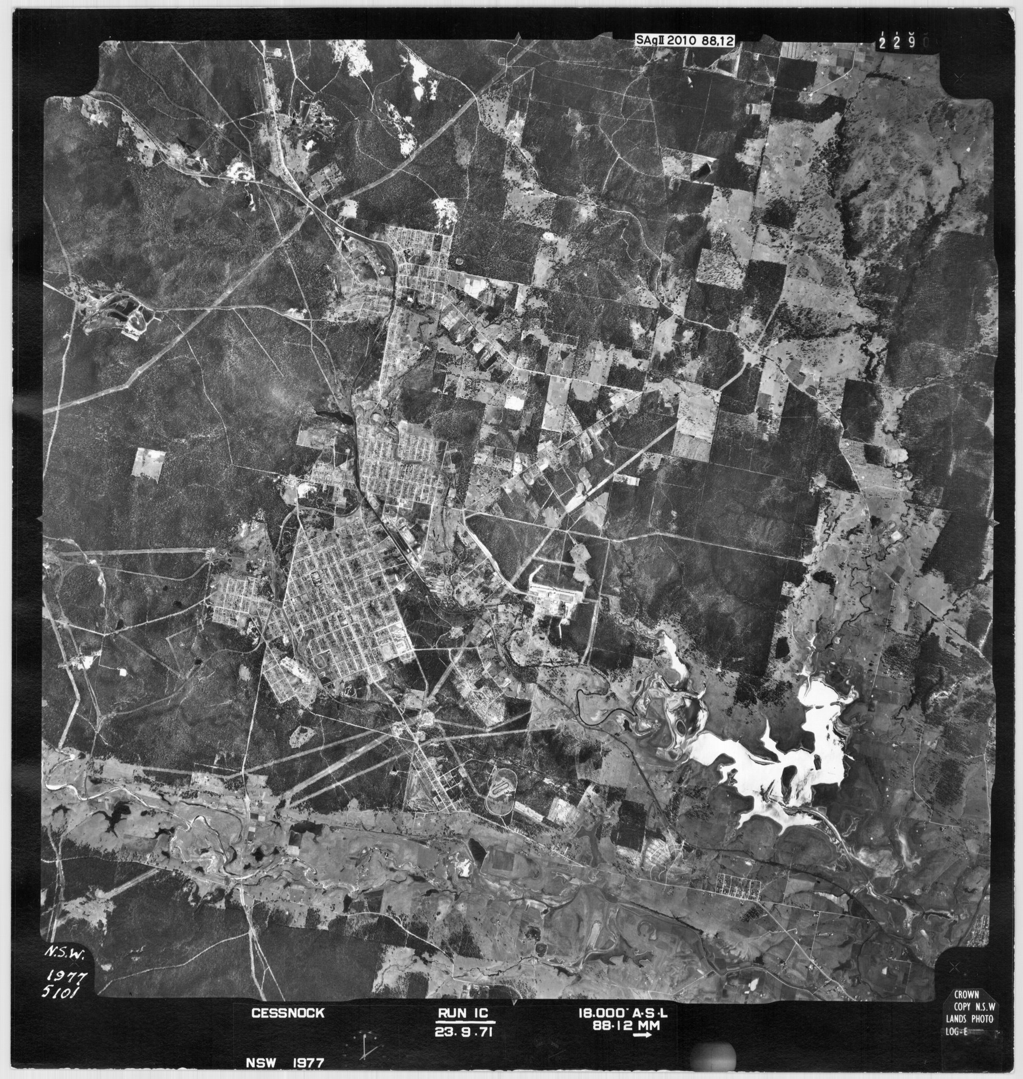 New South Wales. Department of Lands, Cessnock, NSW - Aerial photograph, September 1971 (5101) (23rd September 1971), [CESSNOCK-09-1971-R001C-1977-5101]. Living Histories, accessed 19/03/2026, https://livinghistories.newcastle.edu.au/nodes/view/80520