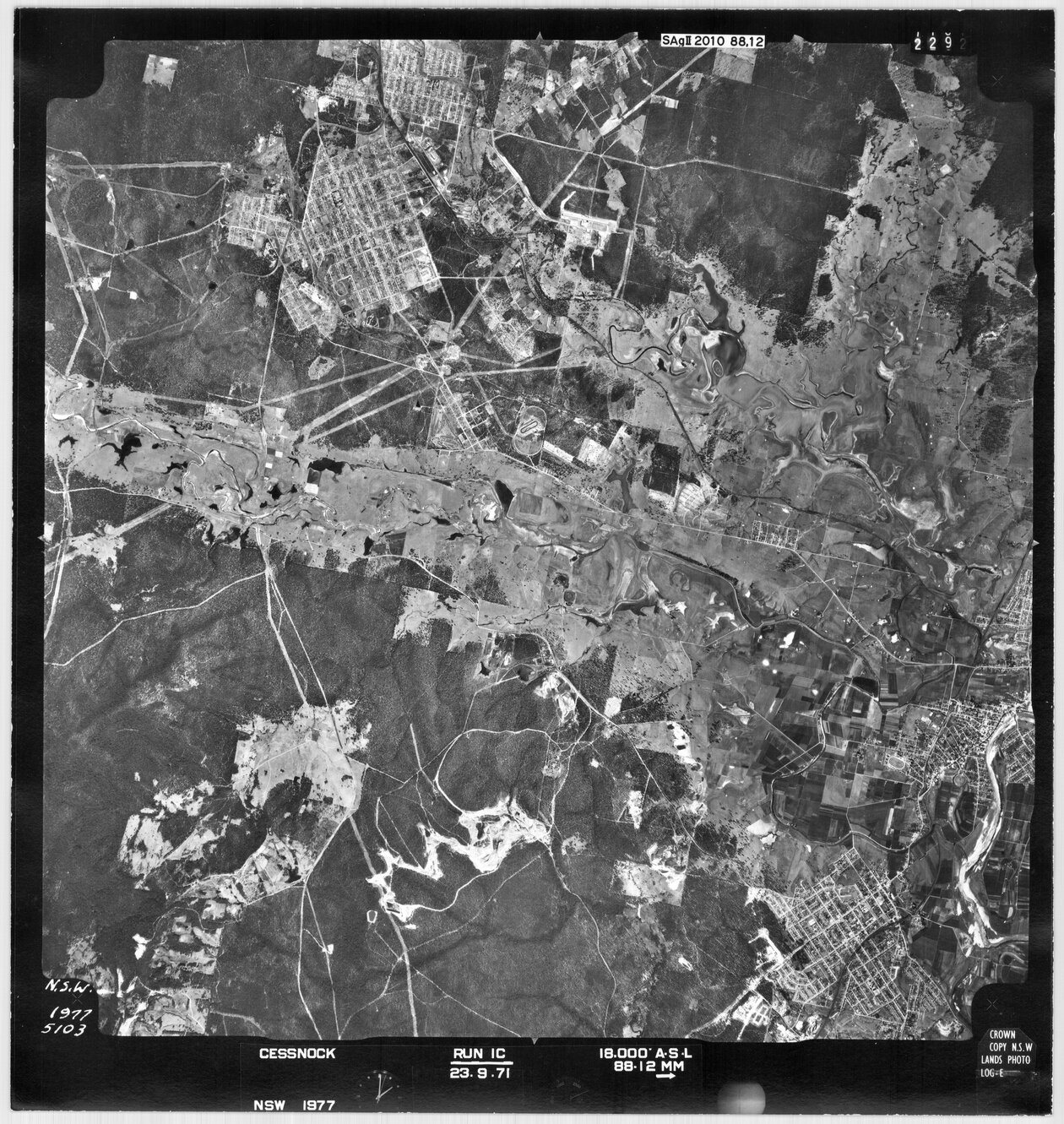 New South Wales. Department of Lands, Cessnock, NSW - Aerial photograph, September 1971 (5103) (23rd September 1971), [CESSNOCK-09-1971-R001C-1977-5103]. Living Histories, accessed 16/02/2026, https://livinghistories.newcastle.edu.au/nodes/view/80522